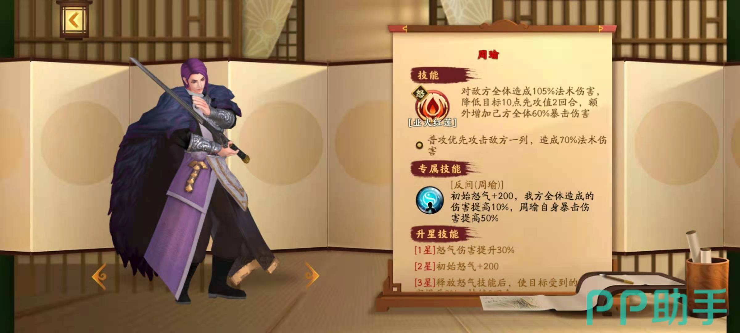 周瑜是吴国的大将,被誉为“江东美男”。在游戏中,周瑜作为一名远程法师型武将,其技能“苦肉计”可以为队友提供回复能力,同时对敌人造成伤害,是一个非常具有辅助作用的武将。