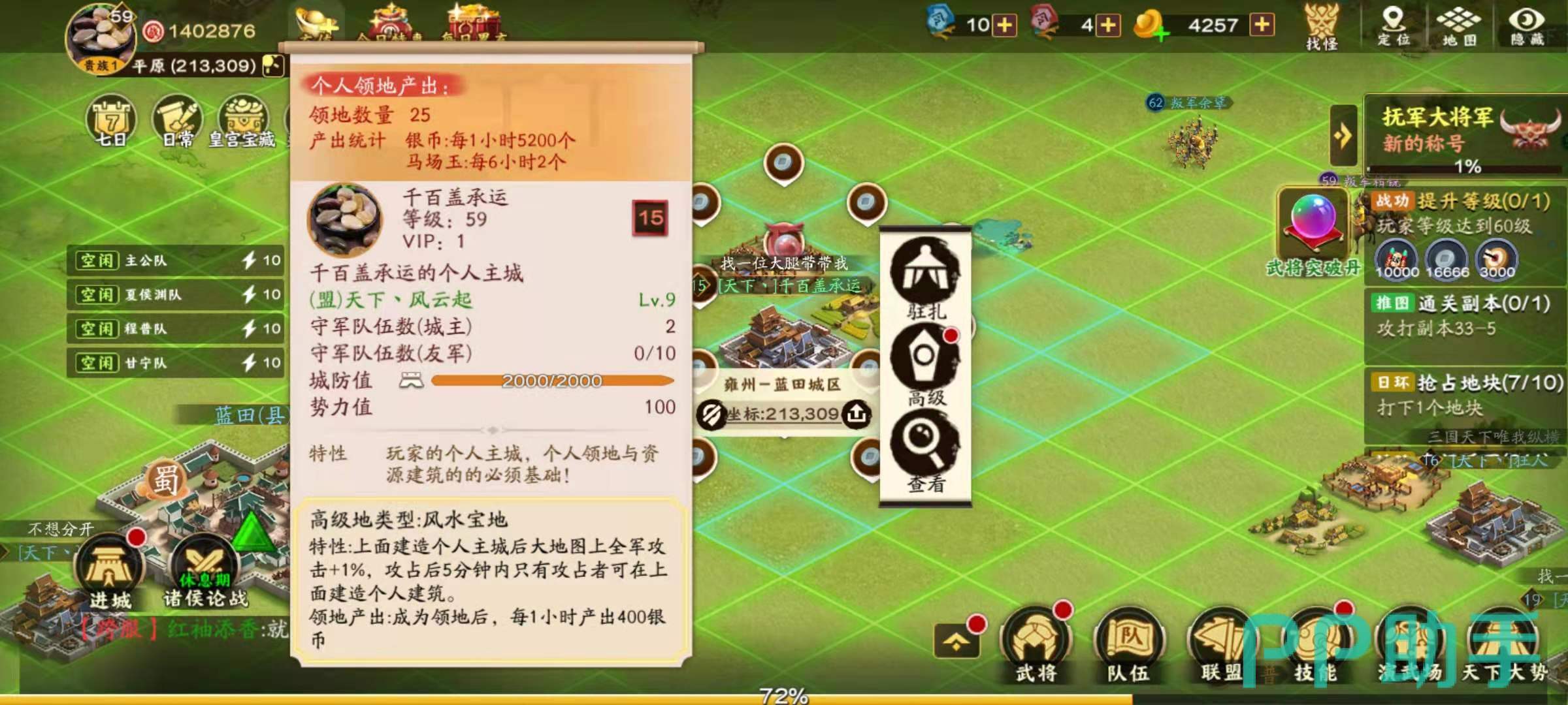 民卫的奖励是当占领之后,玩家从个人主城中出发去打野怪的话,就可以提高队伍对野怪造成的伤害,而且还能额外提供突破丹,每6个小时可以产出12枚突破丹。农田的作用是可以提供每六个小时400枚银币的奖励。最后的风水宝地,风水宝地的作用是可以建设个人主城,提供占领者全部军队的攻击力以及每小时400枚银币的产出。