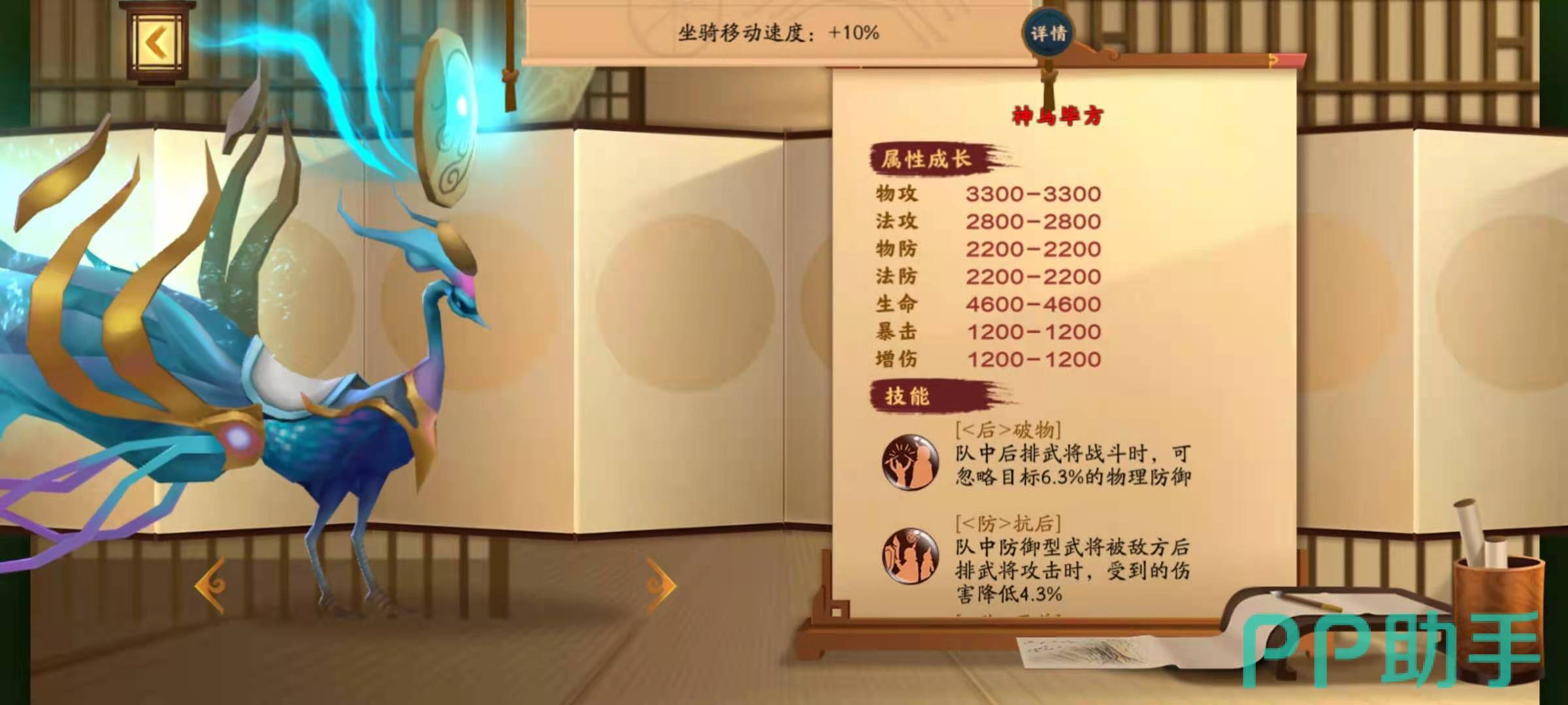 神鸟毕方的特点是物理属性比较高,技能破物,效果是忽略目标的防御力;技能抗后,可以降低对方后排武将的伤害;技能灭前,可以提高我方前排武将的伤害;技能增命,可以提高防御型武将的血量等。这些神兽都是作为坐骑伴随着队伍出战,每一只队伍都可以搭配一只神兽,所以要根据阵容来合理的选择哪只神兽出战。