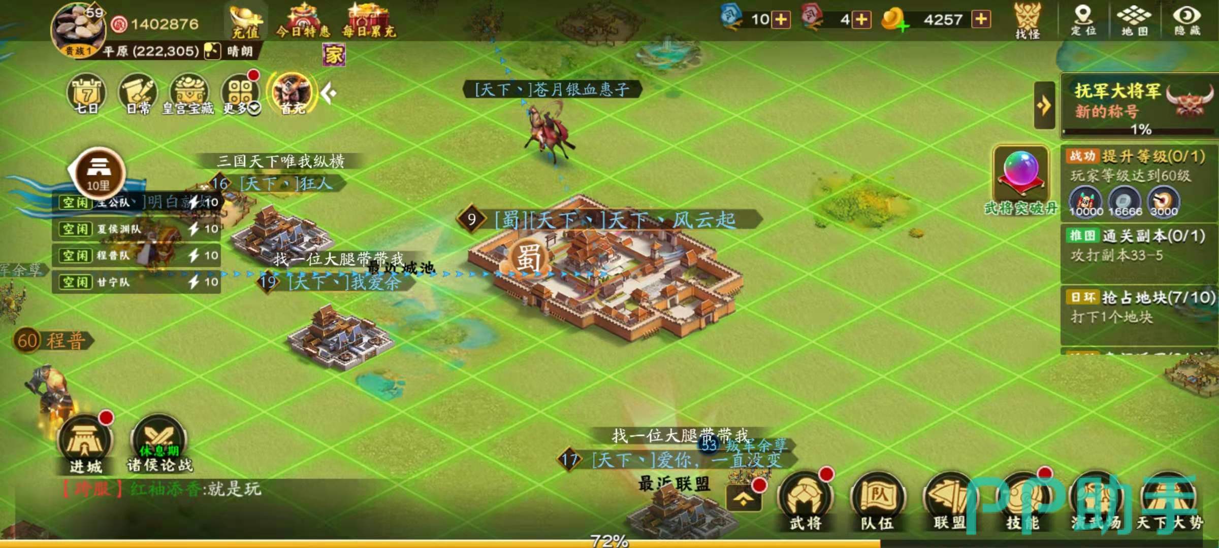 不需要其他国家武将的加入,仅仅是蜀国的武将自身就可以组成不错的阵容,例如五虎将组合,蜀国谋士组合等,不需要和其他势力的武将穿插,这样在外城建设营地的时候就只建造蜀国营地就可以了,对于图纸的需求就降低了很多,保证橙色建筑加成全覆盖。