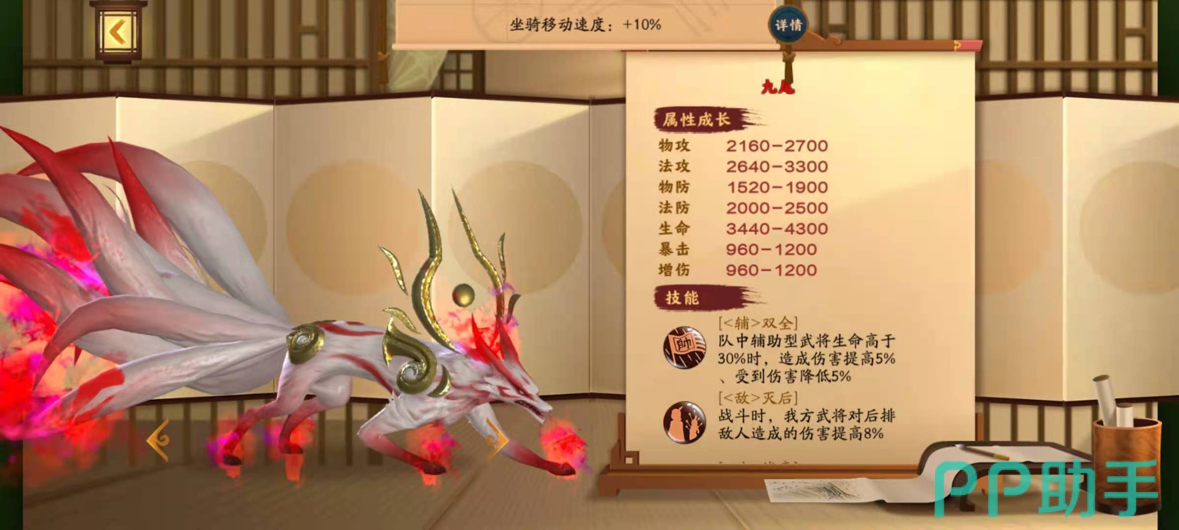 九尾的技能非常全面,技能双全,效果是可以在辅助武将血量高于30%的时候,受到的伤害降低5%;技能灭后,效果是增加我方后排武将造成的伤害提高8%;技能战意,效果是在己方队伍攻击型武将的血量高于半血的时候,造成的伤害提高7.7%;技能增攻,效果是增加全体攻击性武将的4.3%的攻击力。白虎的技能有龟缩,可以降低我方武将在低血量情况下的受到的伤害;技能格挡,可以提高前排武将的格挡率;技能攻弱,可以增加攻击性武将的暴击伤害;技能抗前,恶意降低敌方前排武将的伤害;技能增命,效果是可以增加辅助型武将的最大5%的血量。