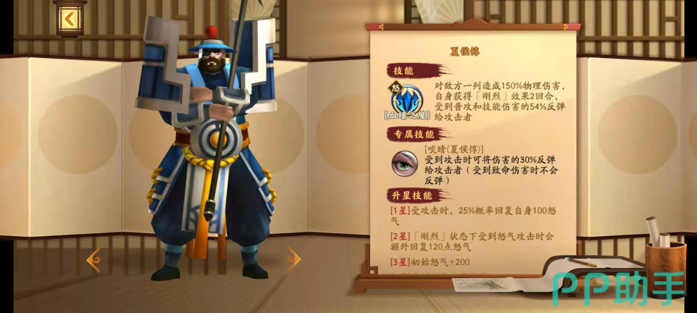 曹操的专属技能是大略,效果是在敌方武将释放了怒气技能之后,曹操可以为己方全体武将附加一个护盾来吸收伤害,护盾持续两个回合自动消失。护盾可以吸收的伤害和被保护目标的血量有关,数值是被保护武将的3%最大血量,这个技能最厉害的地方在于可以叠加。