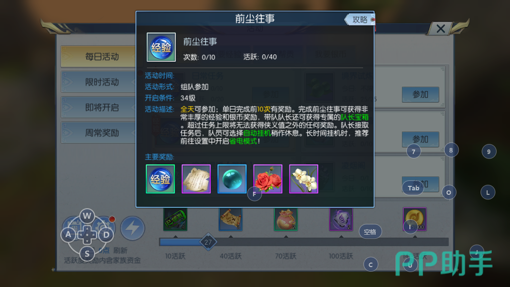 有了比较明确的目的之后就能够很好的选择一条龙的副本了,其次还有另一种选择方式就是根据玩家的需求来进行选择。比如玩家在游戏中非常想要经验奖励那么就可以选择前尘往事”和“日常任务”这两个活动来获得大量的经验。