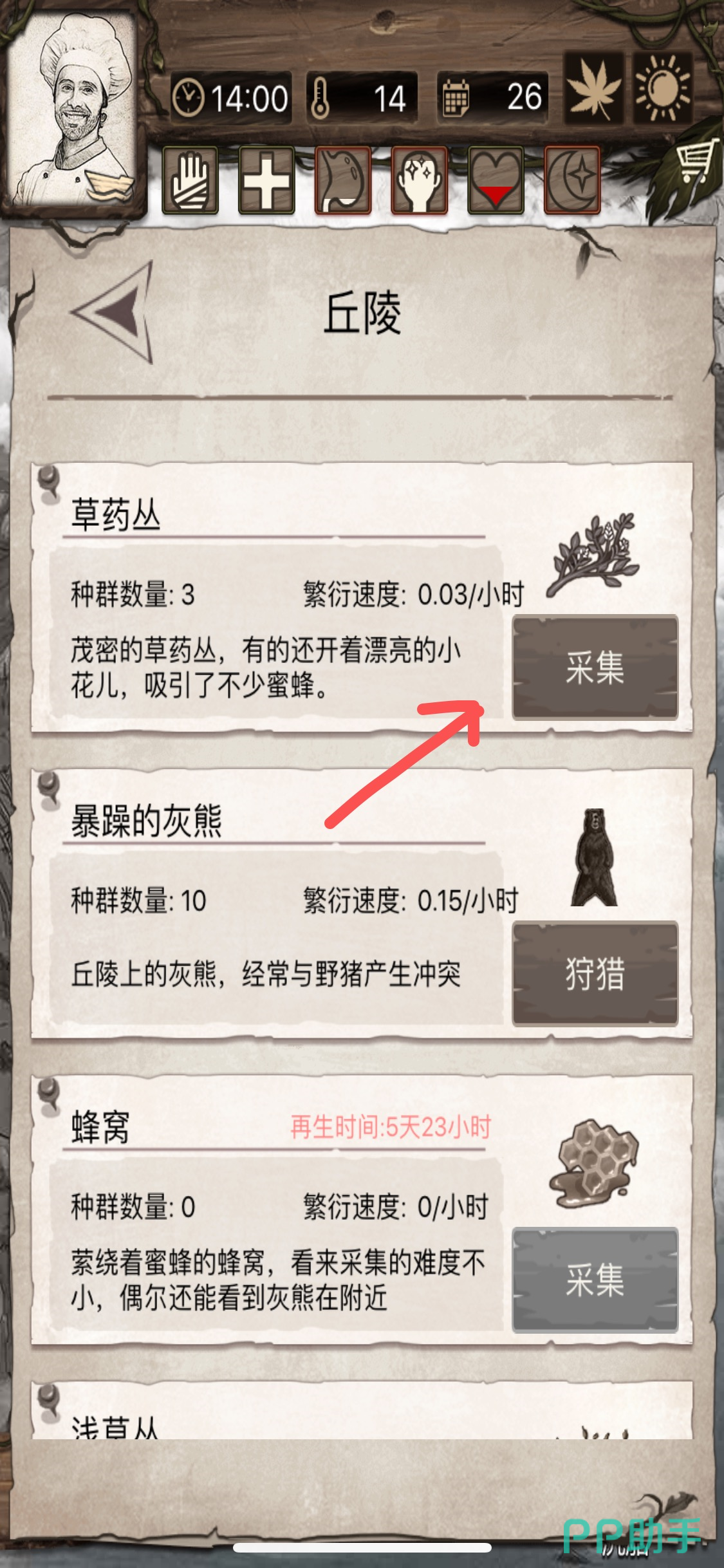 进入丘陵之后,在最上方的草药从这一栏点击采集,所有的采集都记住不要竭泽而渔,每次留一部分让他们生长。