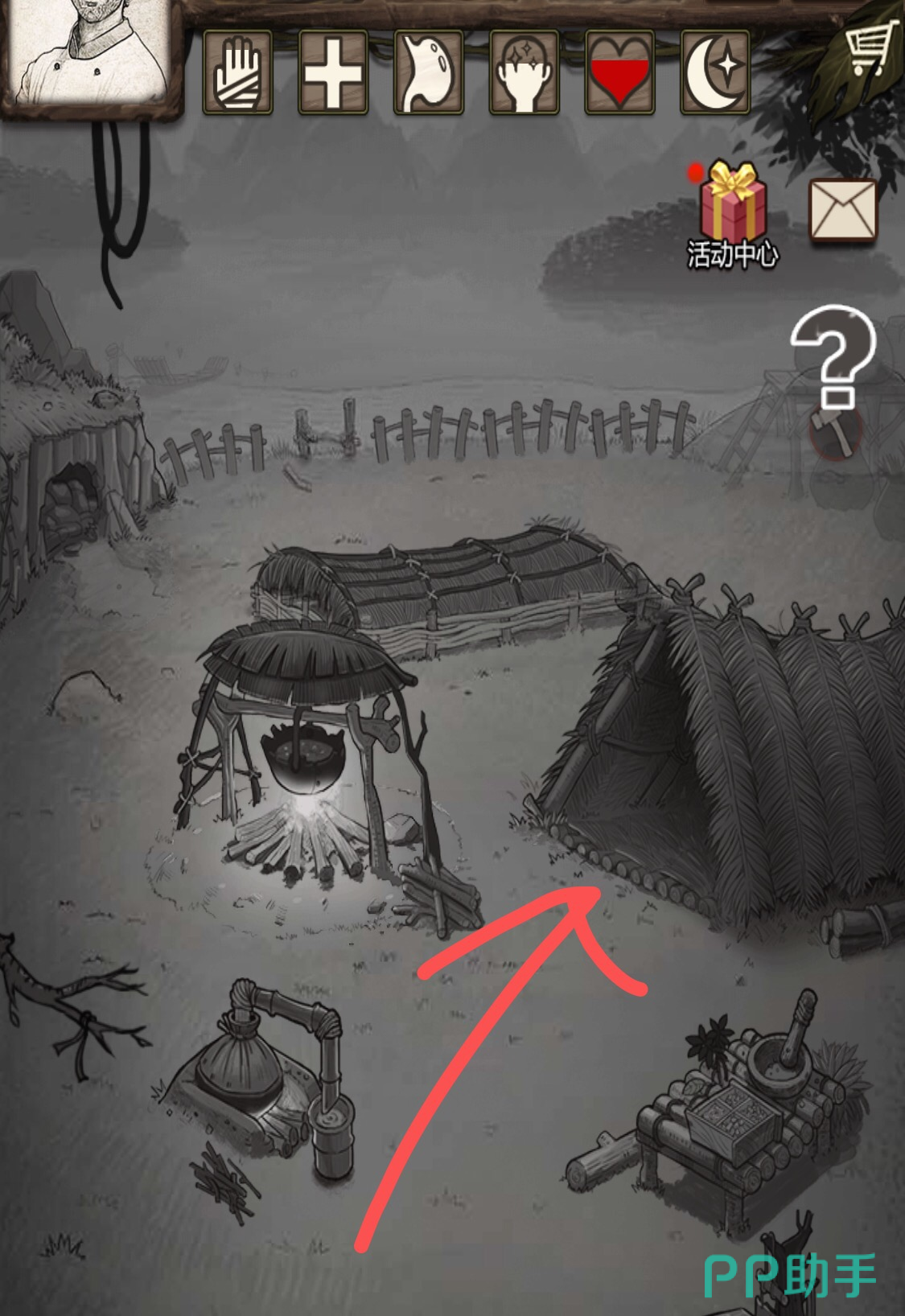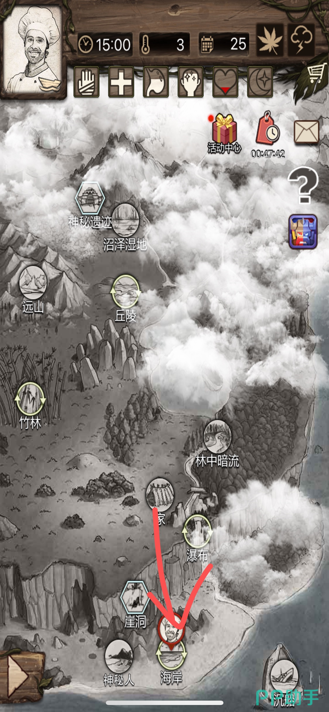 点击营地右下角的栅栏图标,选择出门装备石斧,然后点击确定出门。点击野外地图右下角的【海岸】地图,进入海岸。