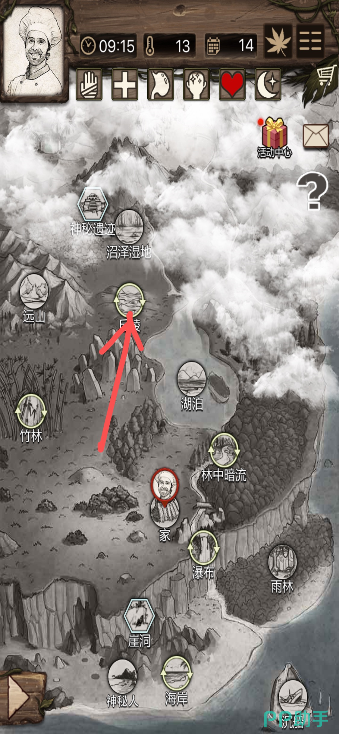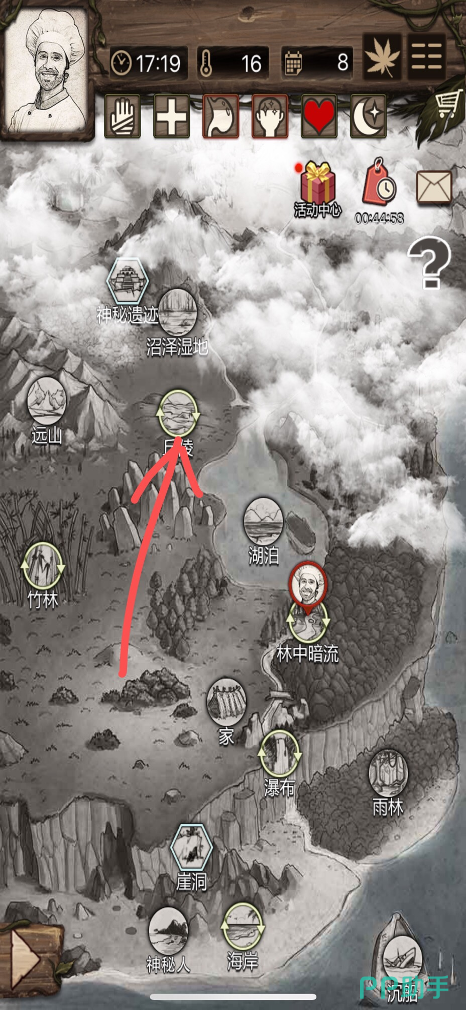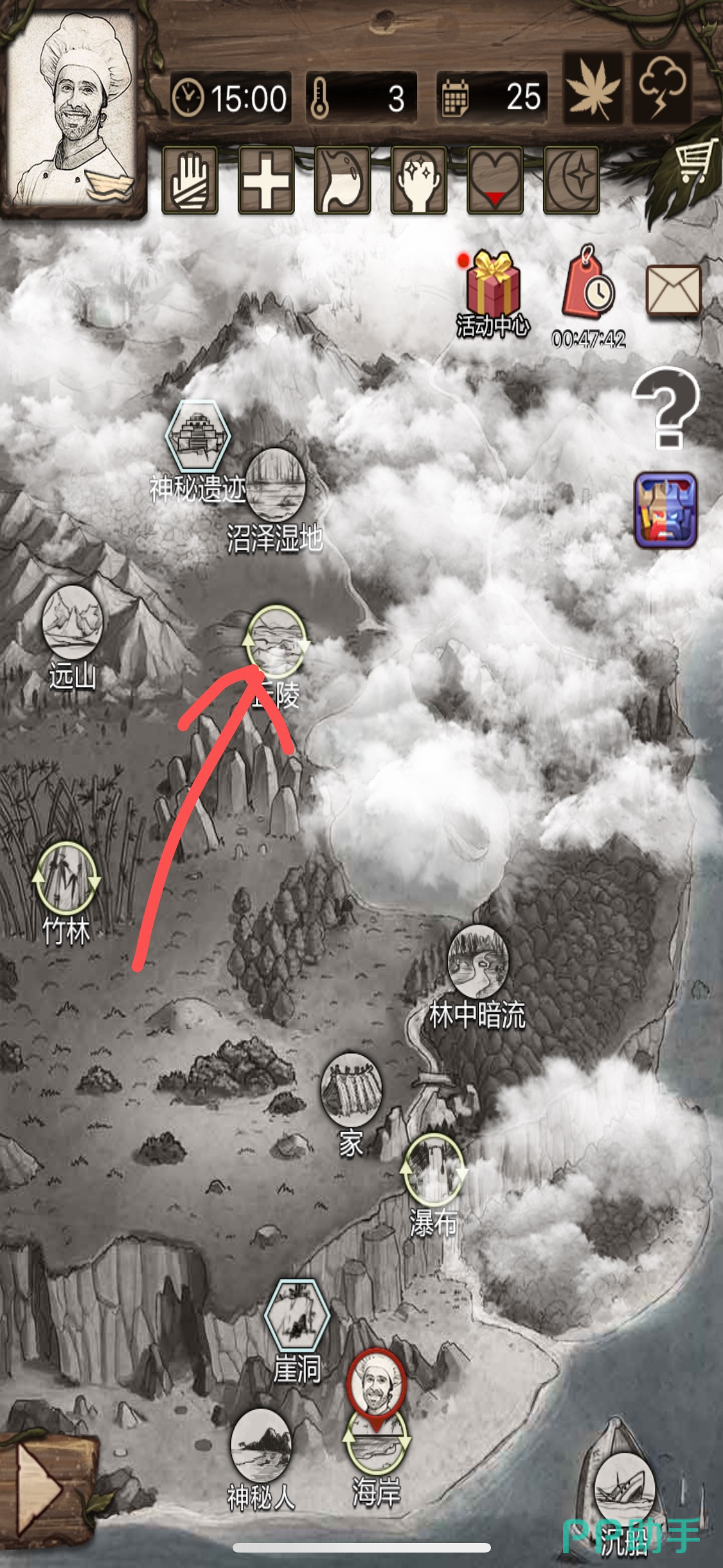 然后退出海岸点击营地,然后我们背包中的资源就会放入仓库。这时候我们再点击栅栏出发,在野外地图中选择位于营地上方的【丘陵】地图,花费一定时间前往(因为丘陵的路程比较远,会造成饥饿,所以出门前需要准备一点食物带在背包。)