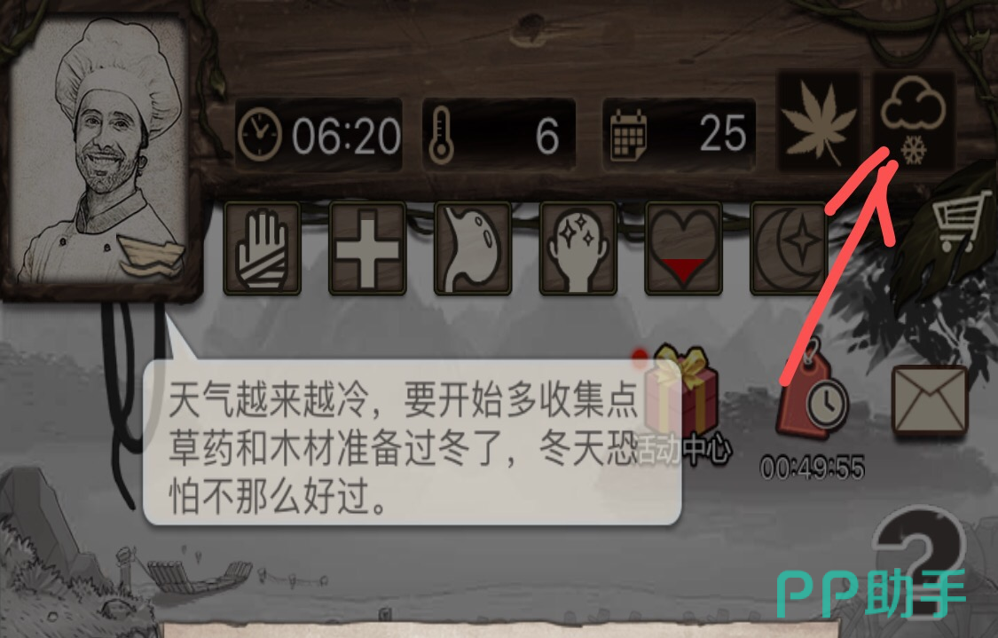 在游戏界面的右上角有两个图标,左边的小图标代表当前的季节,右边的小图标代表当天的天气。我们在左边小图标变成枫叶形状的时候(也就是秋季),就要开始为冬天做足准备。