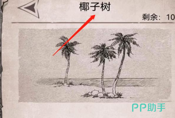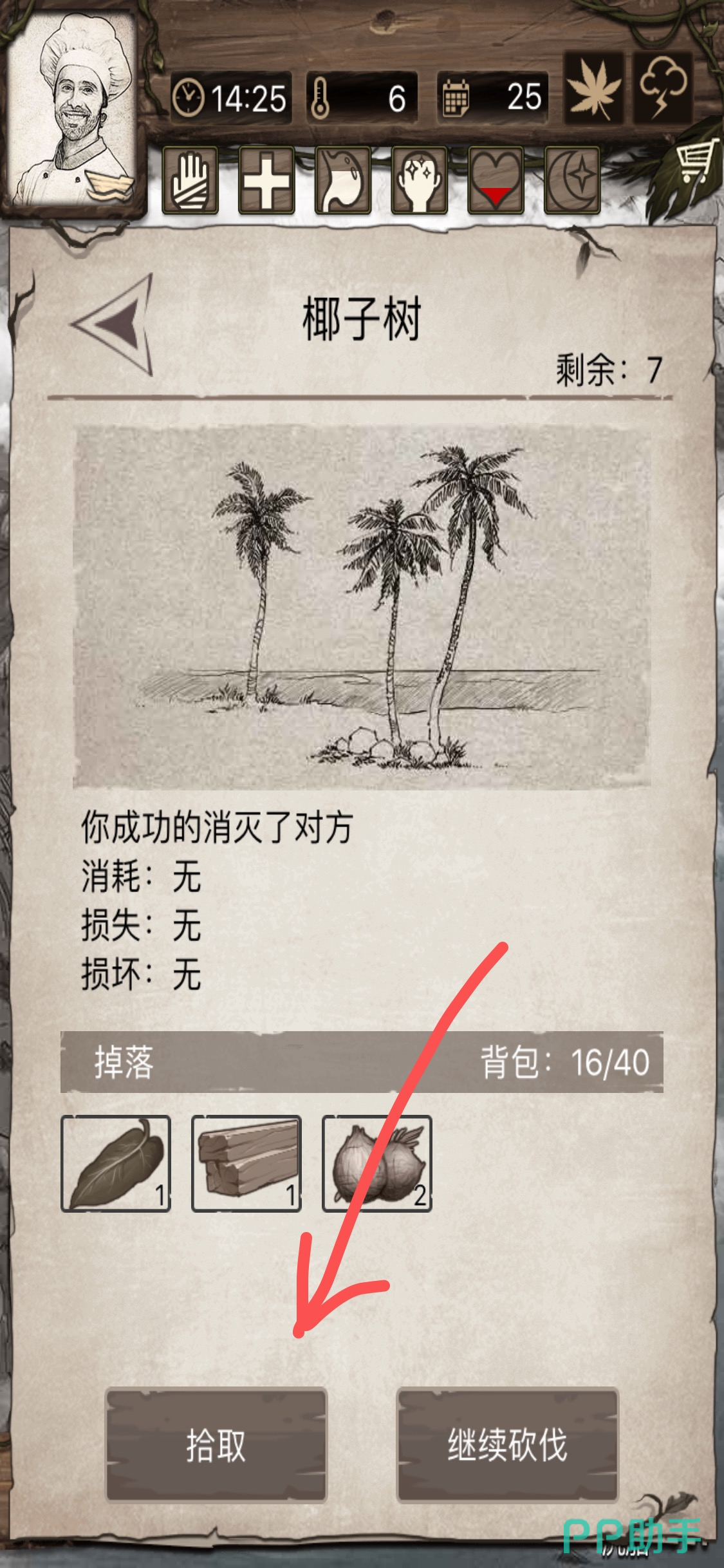 海岸能有椰子树供我们砍伐,点击砍伐(注意查看右上角的剩余量,不能一次性砍完,每次都要剩余一部分,才能生长的更快。)砍伐椰子树会得到阔叶、木材和椰子。点击拾取装入背包。