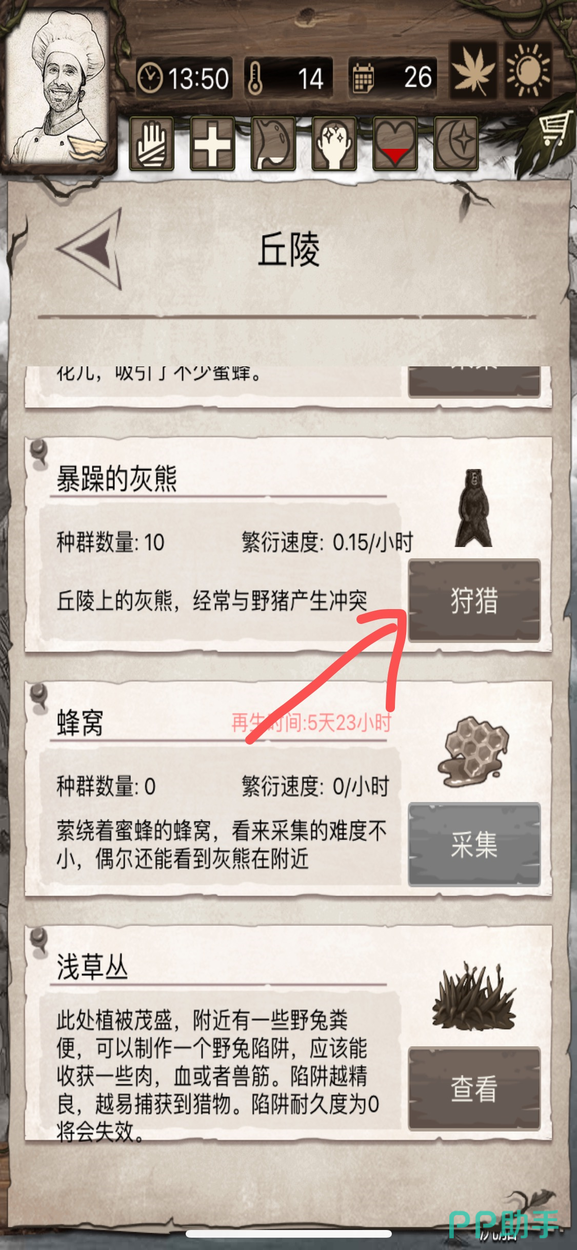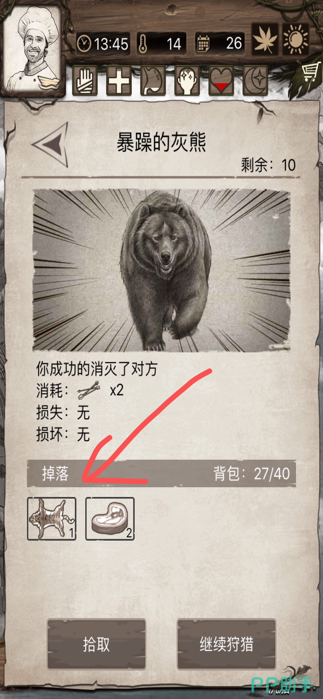 徒步到丘陵地图,然后点击第二栏的【狩猎】,进入和灰熊的战斗,使用高级的石斧能够更快速的击杀掉它。不是每次击杀都能够掉落皮毛,我们需要多击杀2到三次,当灰熊掉落了皮毛之后点击拾取再离开。