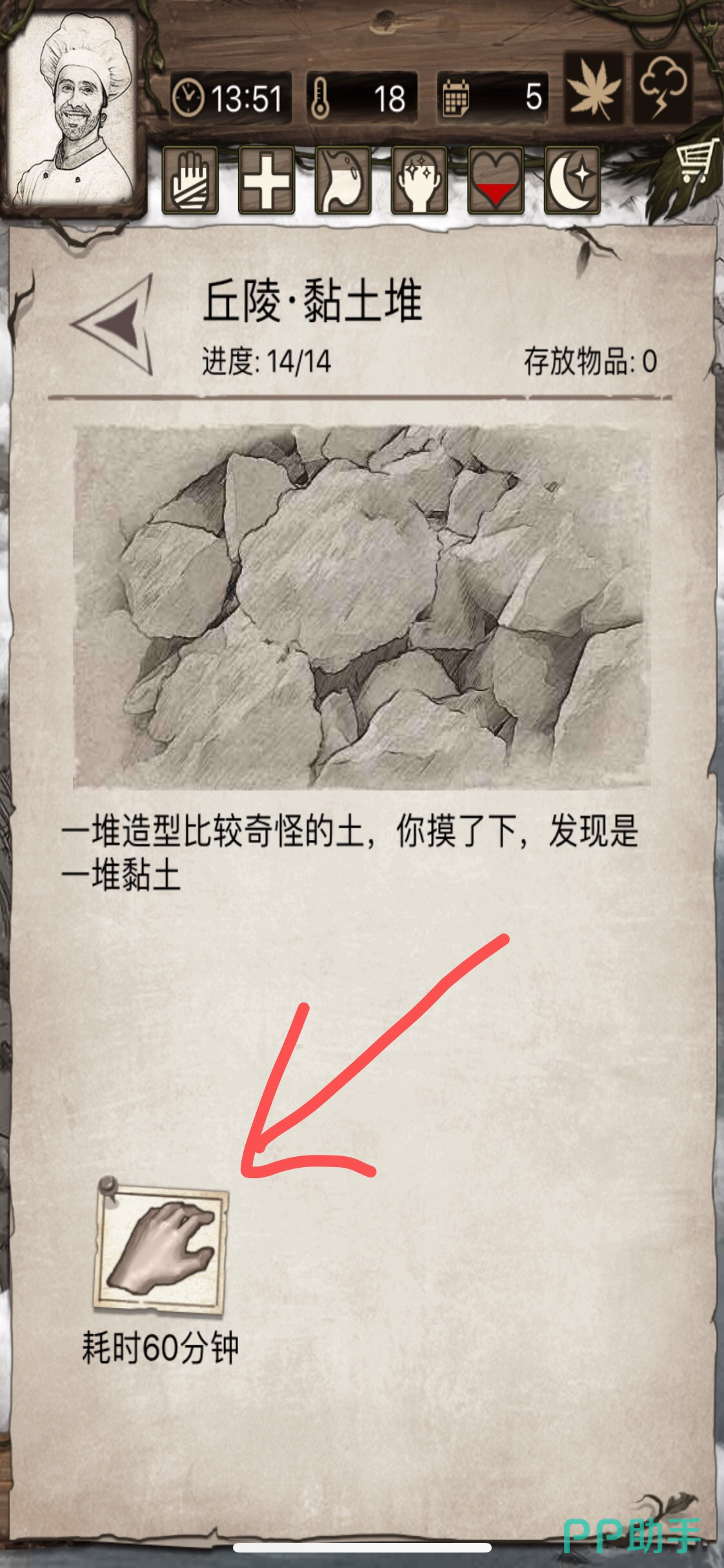 第四步:当出现【丘陵.黏土堆】就是我们要找的黏土获取地。点击手形状的图标耗时一小时挖掘。