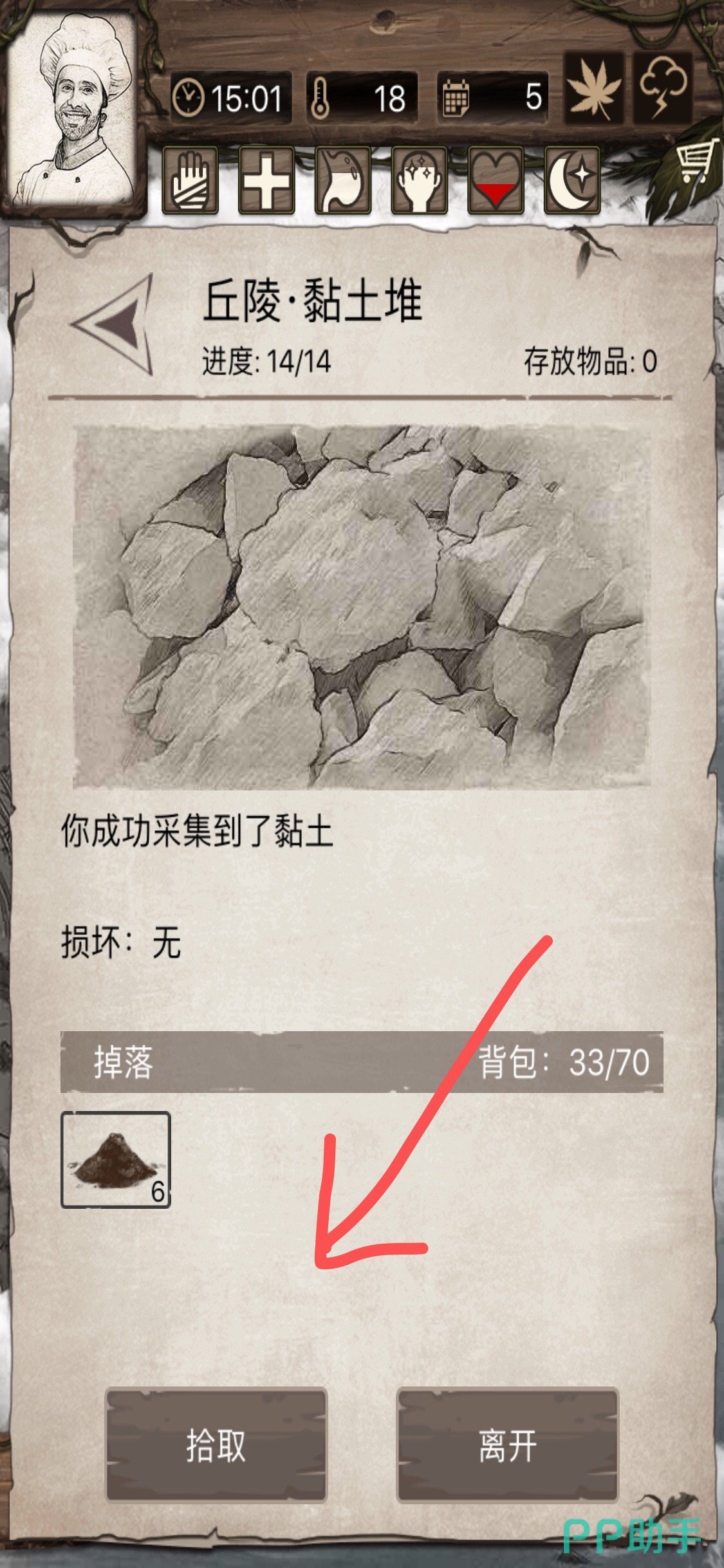 第五步:挖完之后,点击【拾取】将黏土装入背包。然后返回营地,黏土就能够在营地中制作物品了。