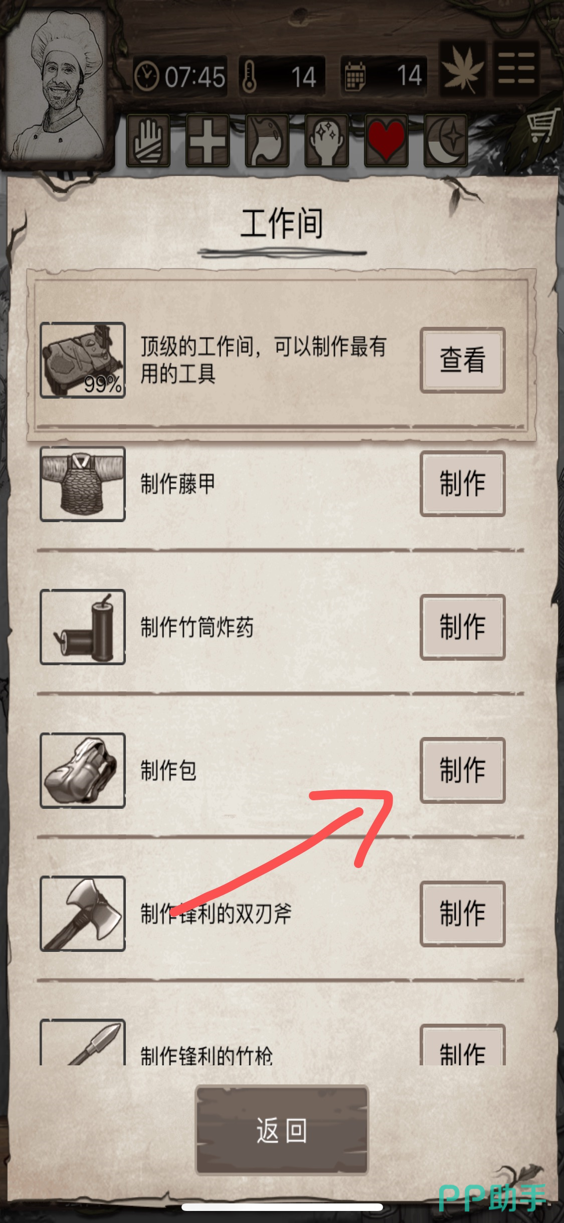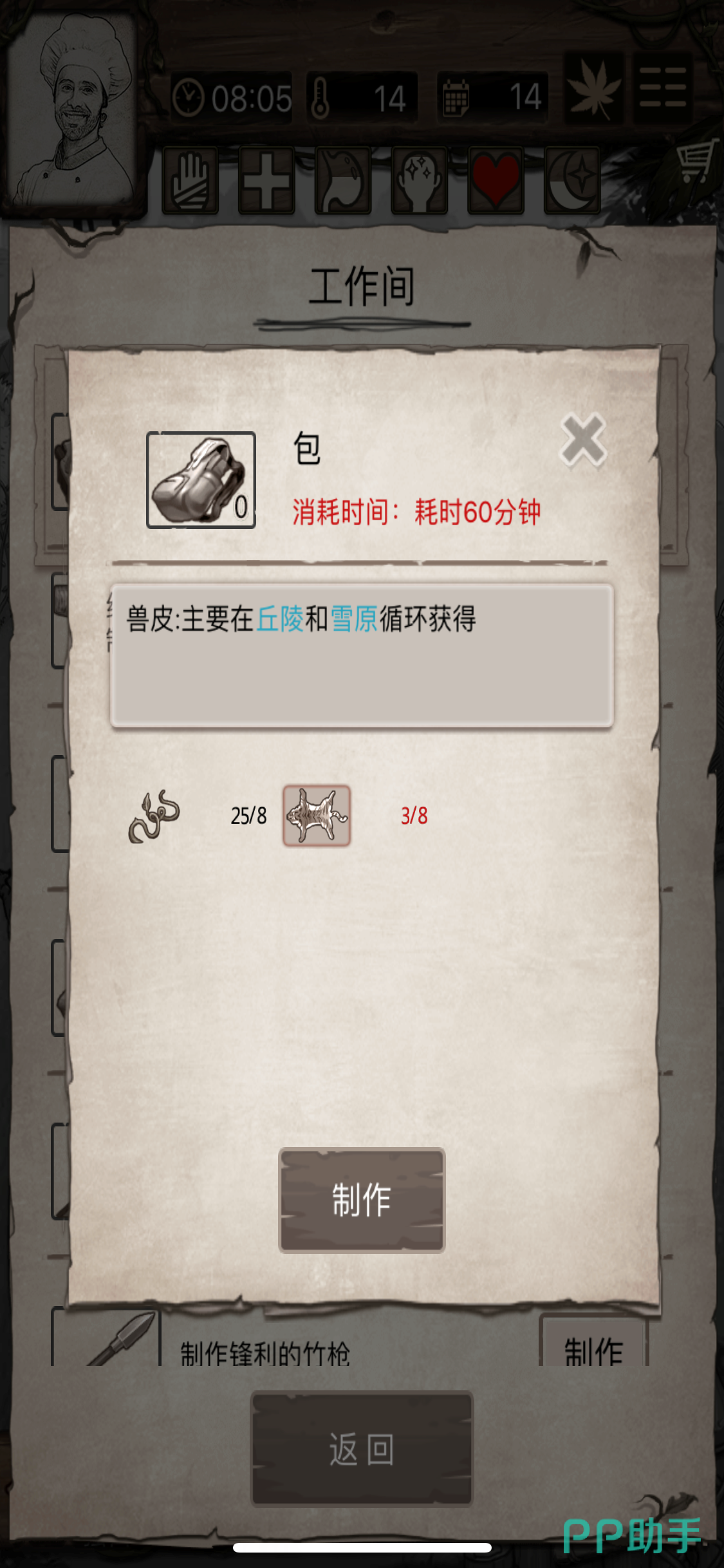 第九步:当所有的物资都采集齐全,就回到营地,打开工作台,选择【背包】——制作。当背包制作完成之后就会扩大背包的容量,每次能够负重更多的物资。