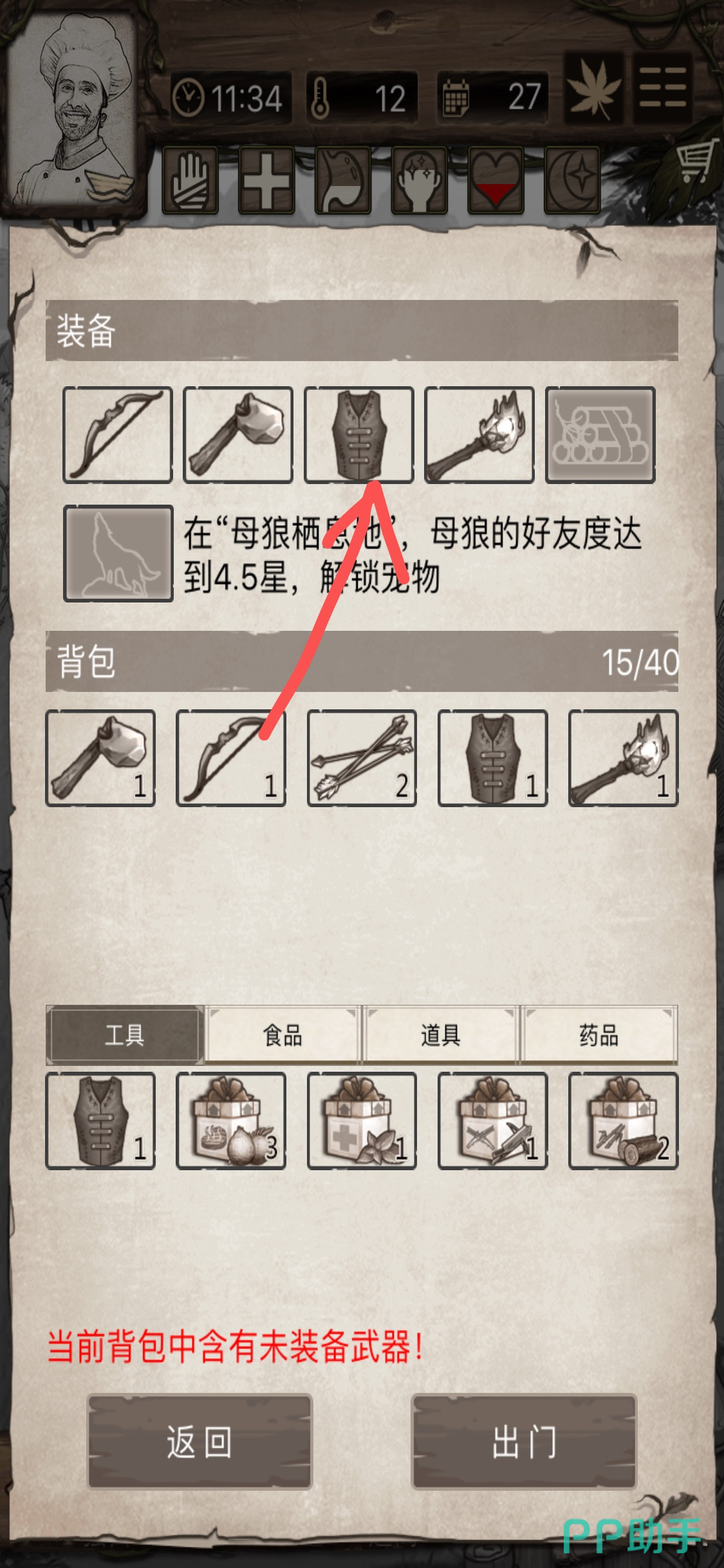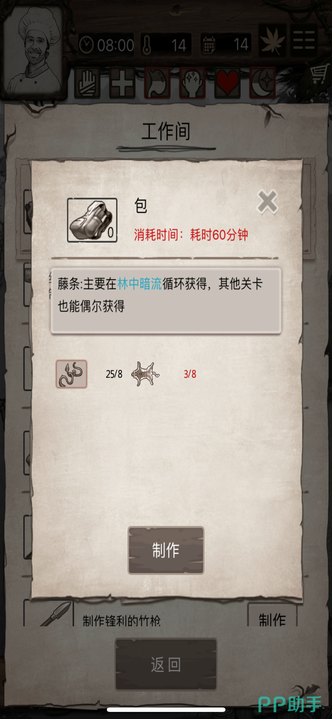 同理,在林中暗流中选择采集【藤蔓】,当制作皮甲所需要的物品都集齐之后,回到营地点开工作台,选择制作皮甲。然后每次在出门的时候选择出门装备都要记得将皮甲装备上去,才能起到御寒的作用。