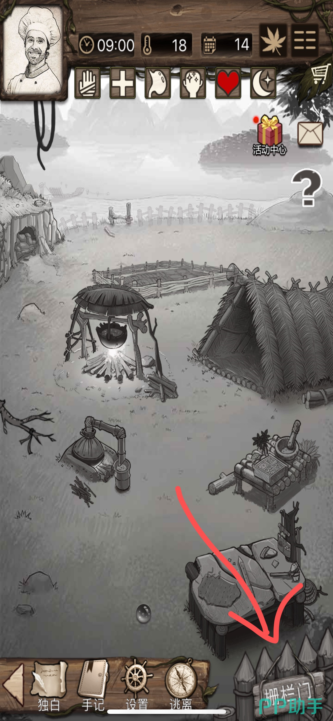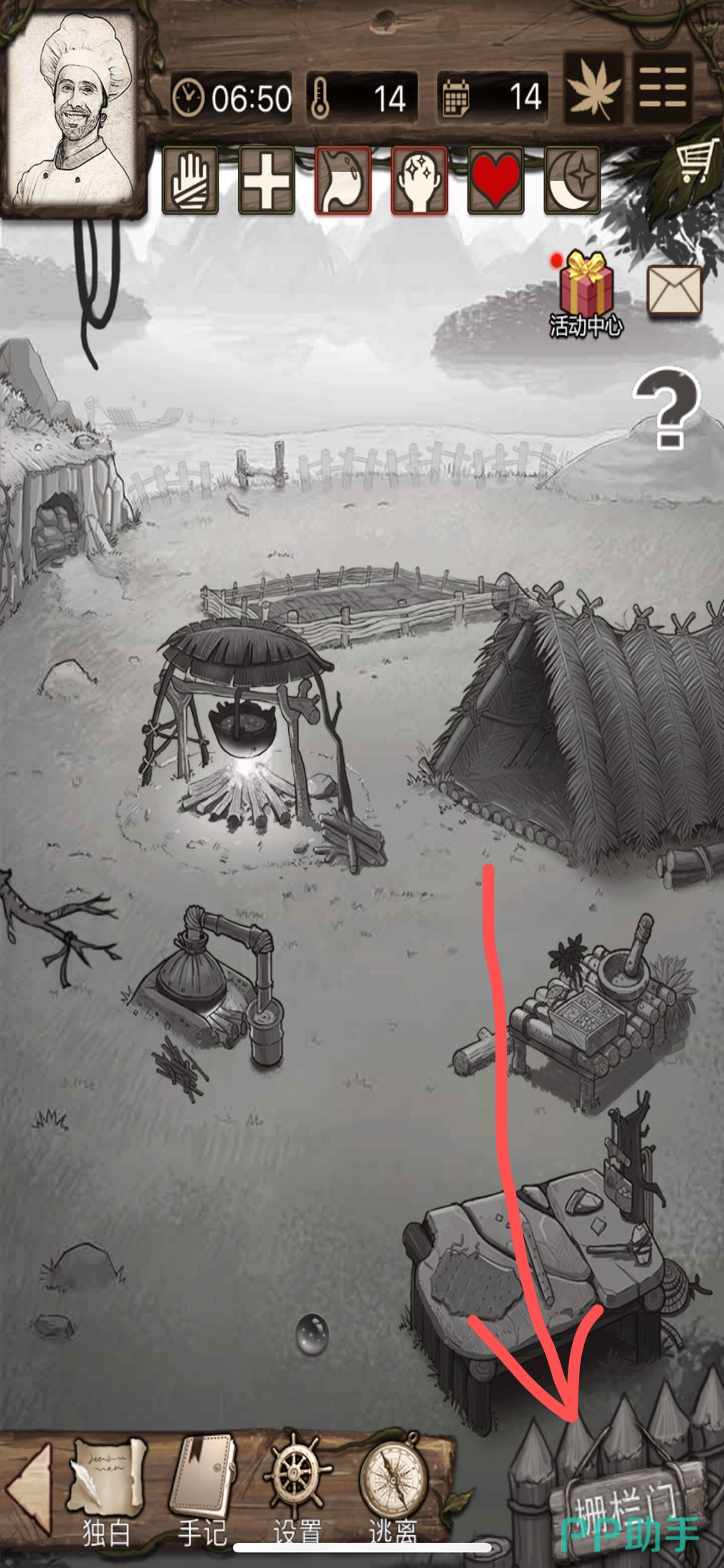第四步:点击游戏营地主界面右下角的【栅栏】,出门采集材料。