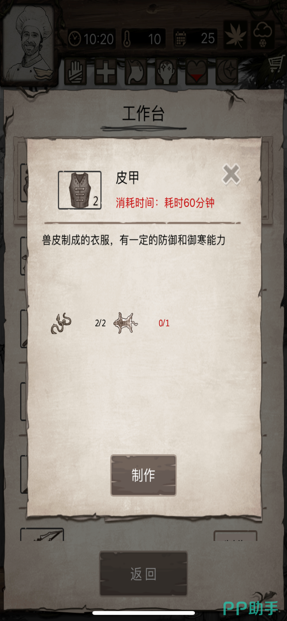 除了储备木材和草药之外,制作御寒的服装也很重要。在营地右下角的工作台中找到【皮甲】这一装备,点开可以看到制作皮甲需要【藤蔓】和【皮毛】,其中【藤蔓】可以在林中暗流地图中获得,别的地图也能够得到,而皮毛主要在丘陵中通过狩猎得到。