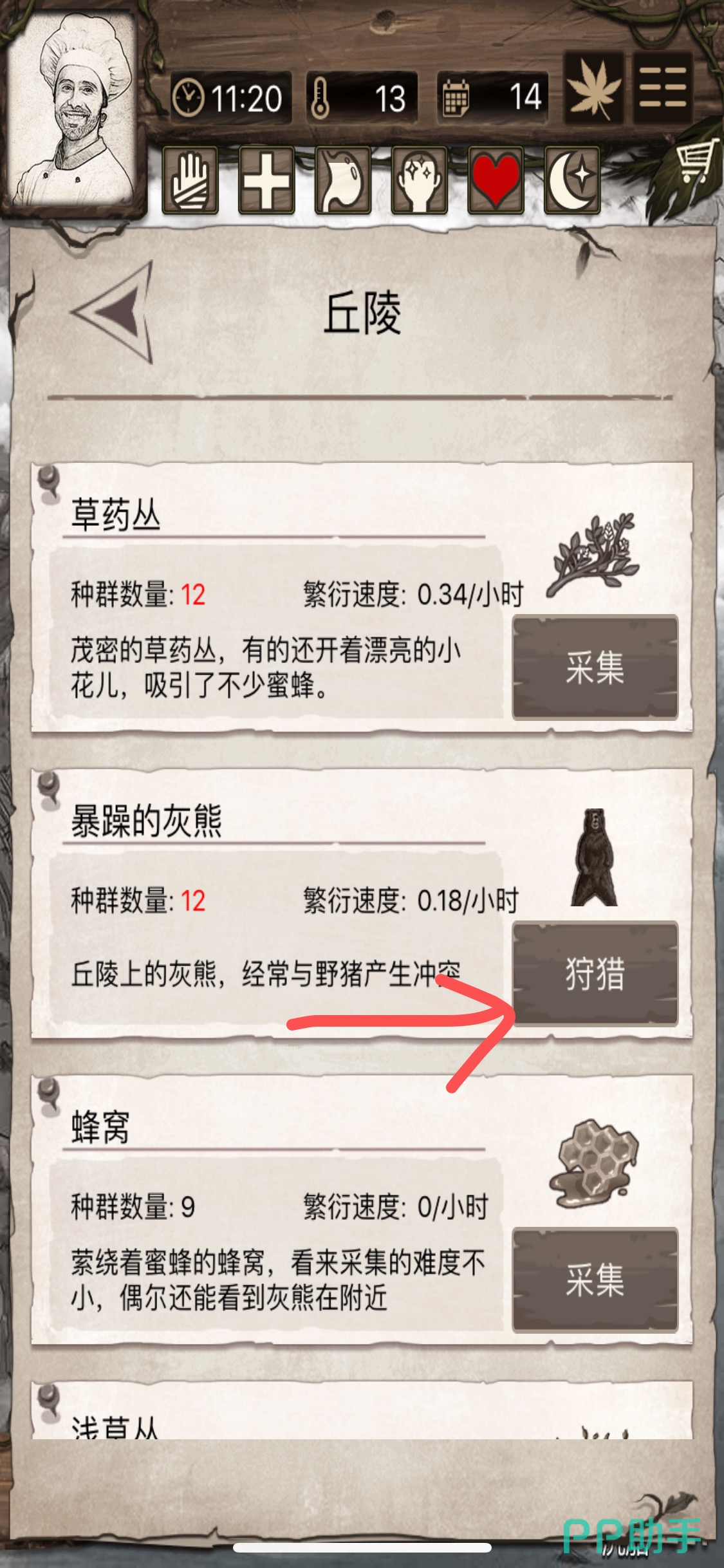 第六步:在丘陵界面第二栏有【暴躁的灰熊】,点击狩猎就有机会获得兽皮。但是不是百分之百会掉落。