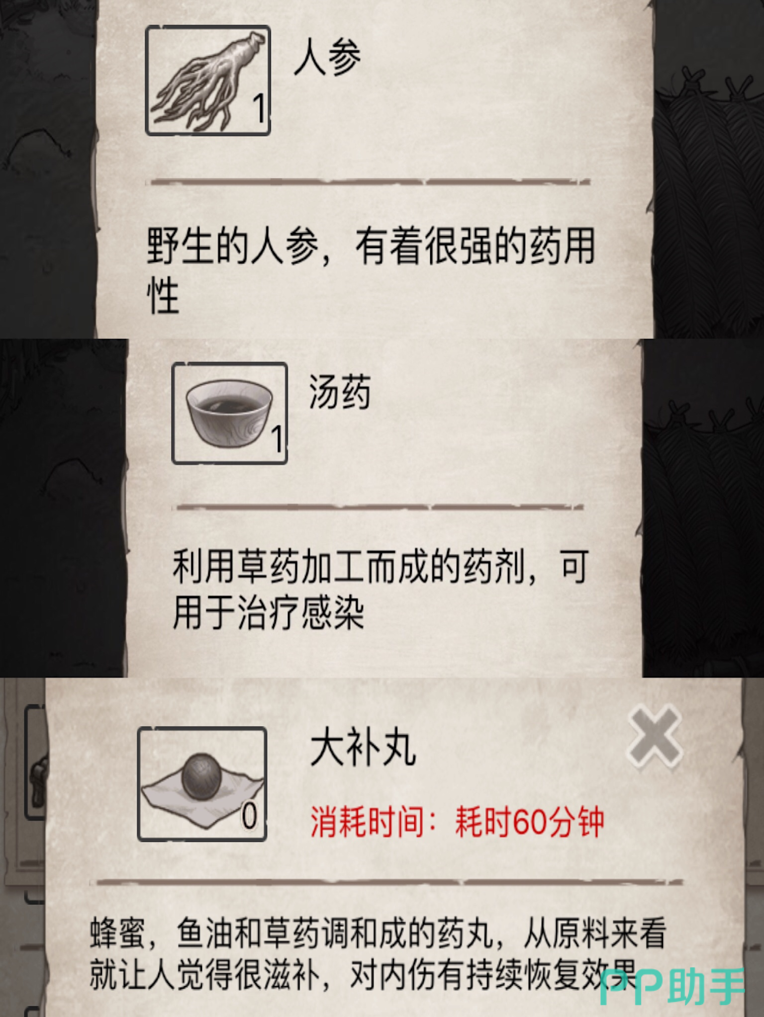 人参是在野外做任务有机会获得,或者是金雕等友好程度高的动物会随机赠与。而大补丸和汤药制作的方法是在营地的药物台上选择相应的物品,点击制作。