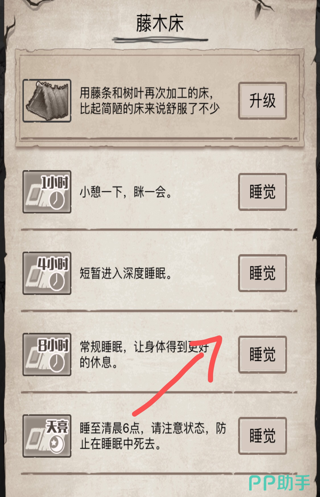 选择8小时的睡眠,这栏睡眠恢复的能力最好。当然睡觉还和我们的床的等级高低有一定的关系,等级越高的床睡眠质量越好,相应的回复的生命值就越高。当我们睡够生命值接近满分状态之后,就能够再次出门去狩猎和采集了。
