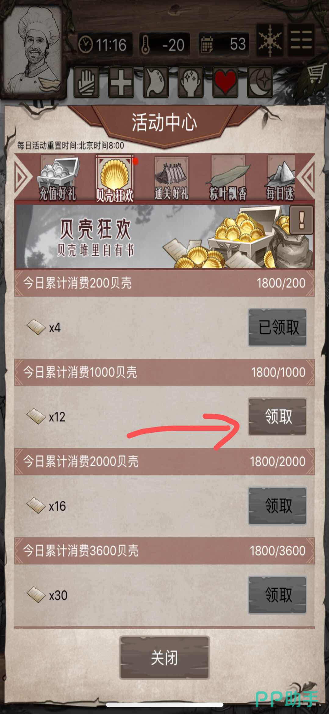 二、在进入游戏的影帝主界面右上角有一个活动中心,点击可以领取各类任务完成之后获得的贝壳和求生页。