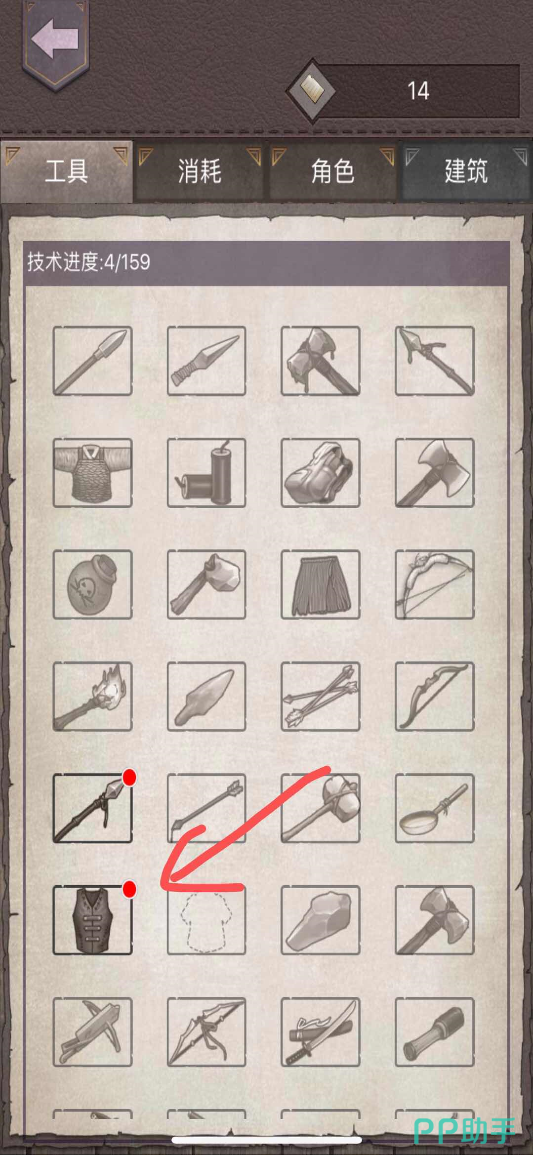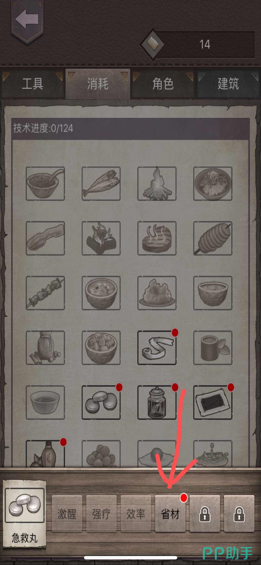 第二步:求生册总共分为四大类,分别是工具(游戏中玩家制作的各类武器和工具)、消耗(玩家在游戏中烹饪的食物、制作的医药品等等)、角色(玩家在游戏中选择的求生者的角色)、建筑(玩家建造的各类工具台、床铺等)。