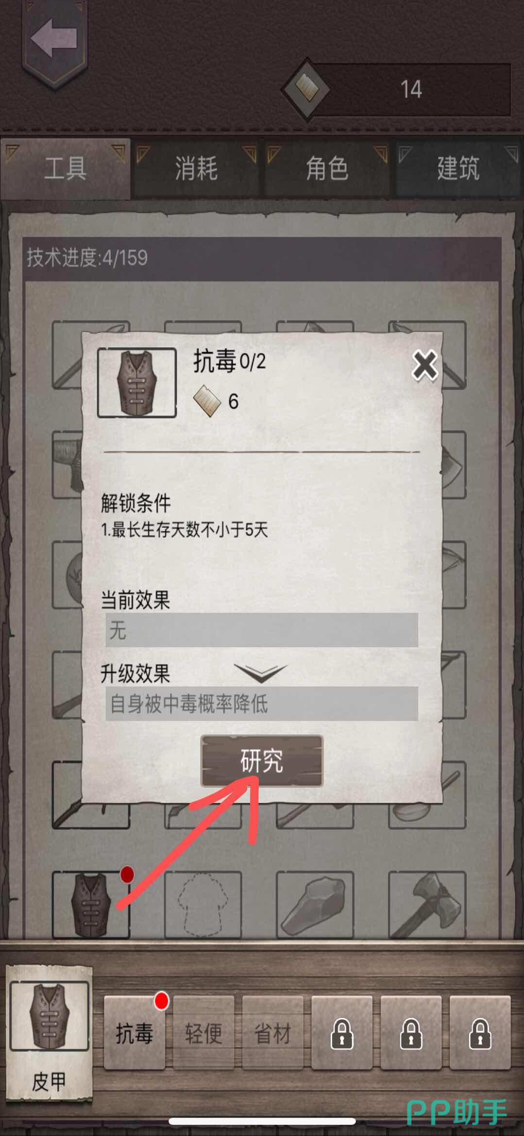 第三步:每一个解锁的图标都会在最下方有一行菜单栏,上面显示着能够提升的属性,如图这个皮甲能够有增加抗毒性的属性,还有轻便和省材的属性以及一部分未解锁我们无法知道的属性。选择我们要升级的属性点击它。