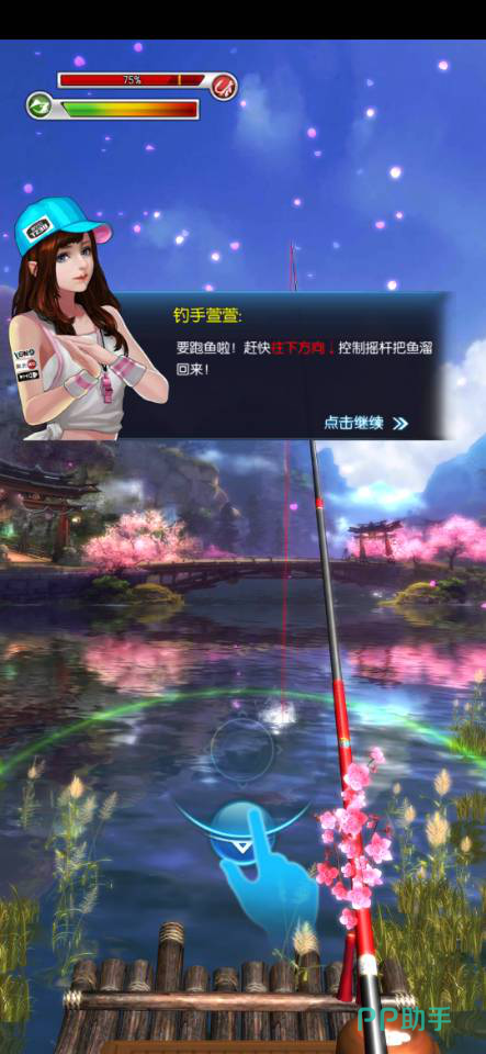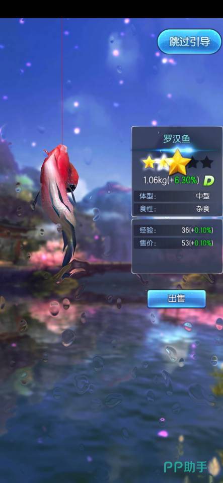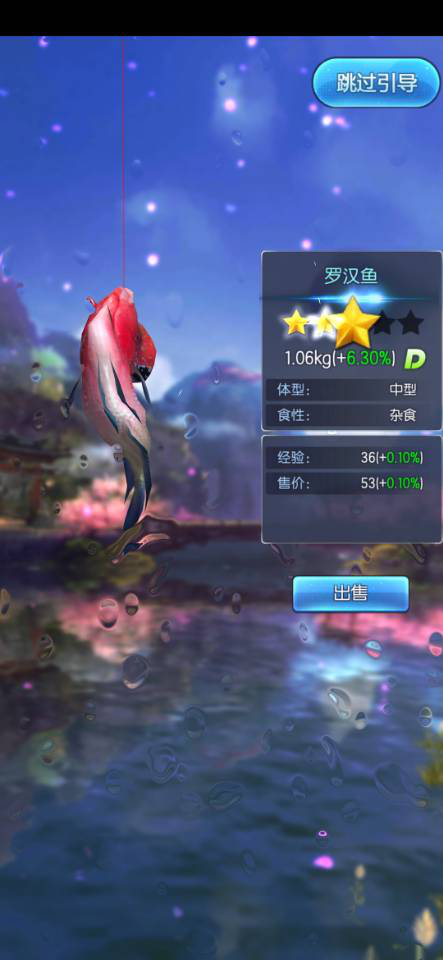 2.当我们看到浮漂上下晃动有鱼上钩时,将手指向里滑动做出拉钓竿的动作,慢慢找到节奏后我们就可以成功将鱼钓上来了,通过钓鱼我们还可以了解不同种类鱼的名称及相关信息,在获得经验的同时进行出售来获得报酬。
