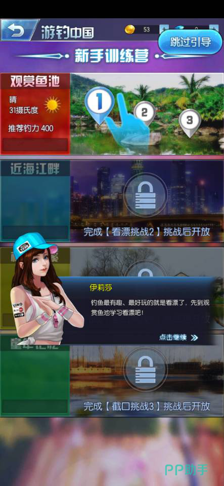 3.游戏中也会安排钓鱼玩家的排名,我们达成成就后可以查看排在世界前几位的玩家信息,当然前期我们还是在新手训练营中混,在四个不同的钓鱼区完成对应的钓鱼关卡。