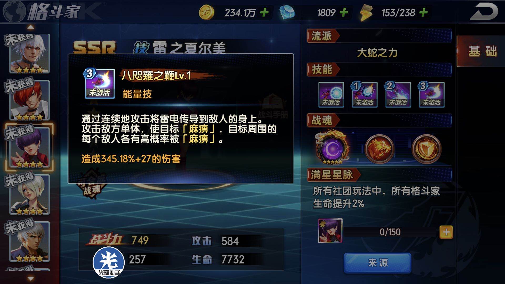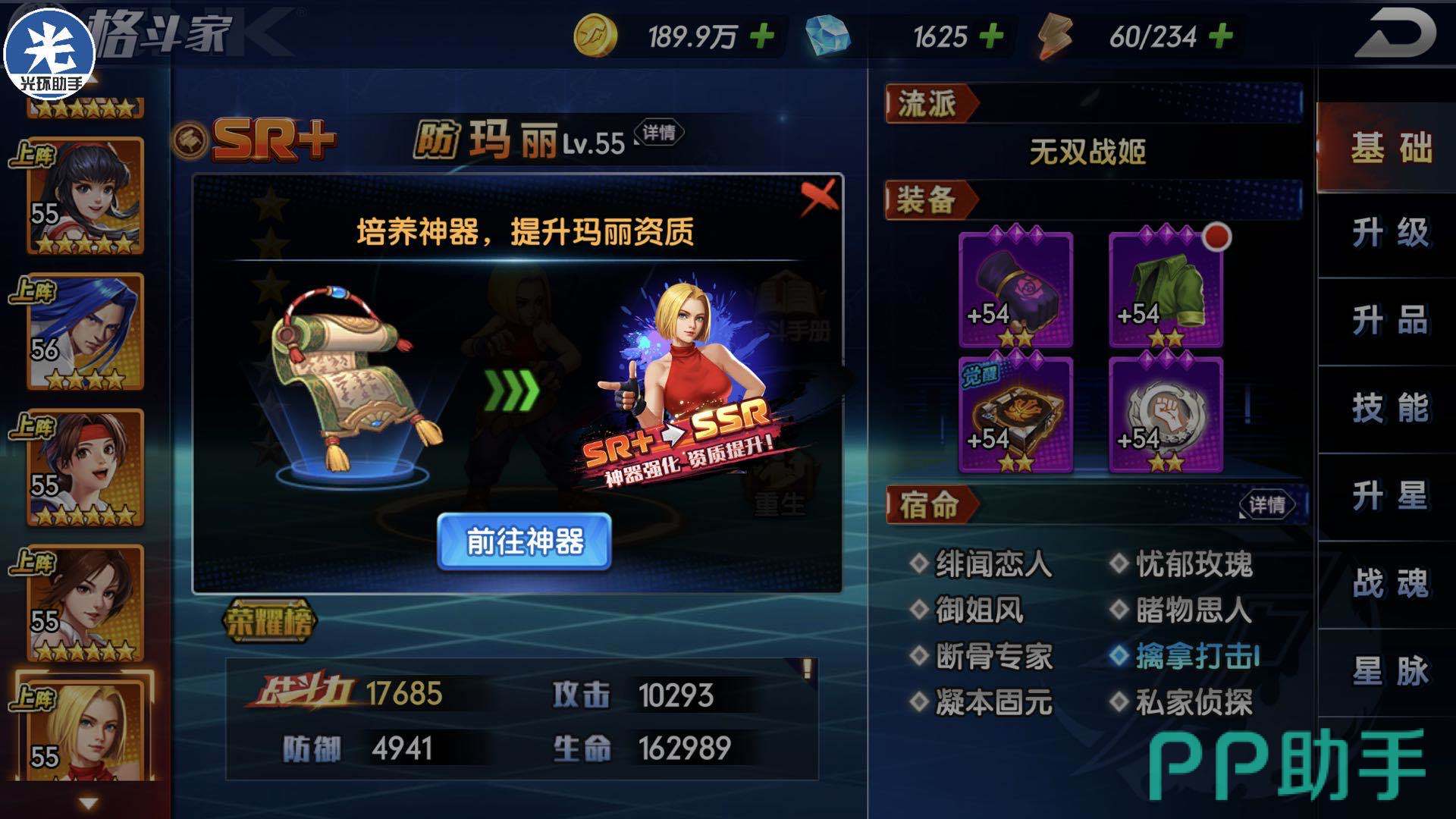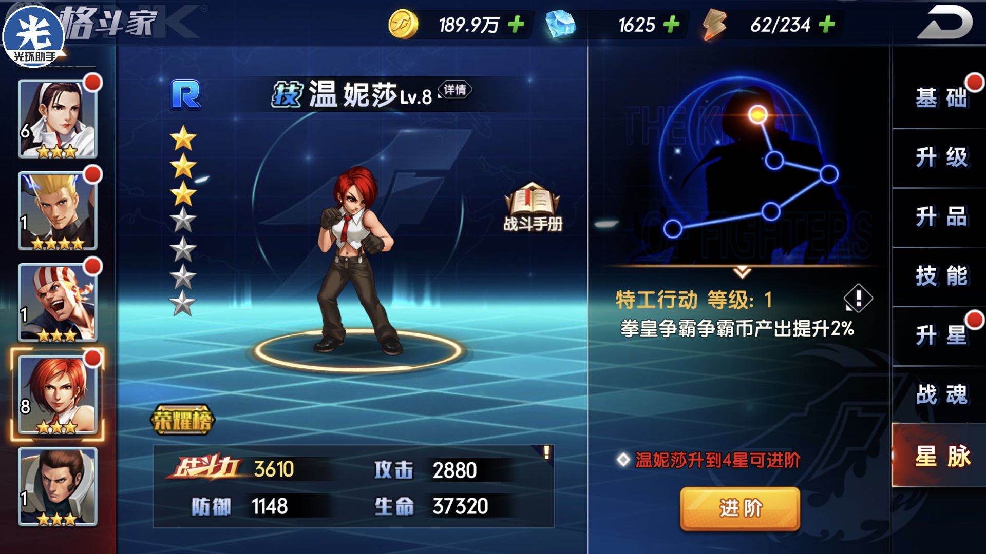首先我们可以通过点击战队——神器,这样一来就可以进入神器系统。进入神器系统之后我们就可以查看到格斗家的进阶详情,并不是什么格斗家都是可以进行升星的,目前在这款手游中,有十二个神器的玩法,但是已经知道可以进行提升资质的格斗家只有三个,他们分别是:草薙京、雅典娜、不知火舞,其它的需要先激活才能够知道了,个就是给草薙京提升资质的,例如一个R升级到SR,但是这里需要消耗的就是神器之源和金币,这个神器之源可以从主线任务中获得哦。