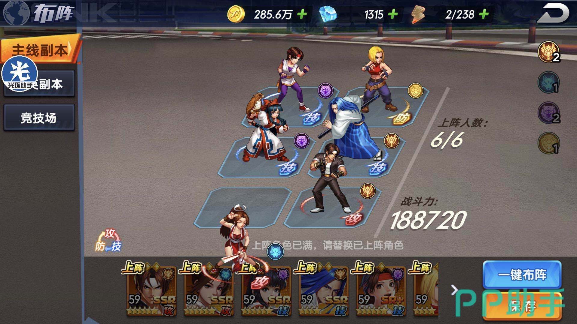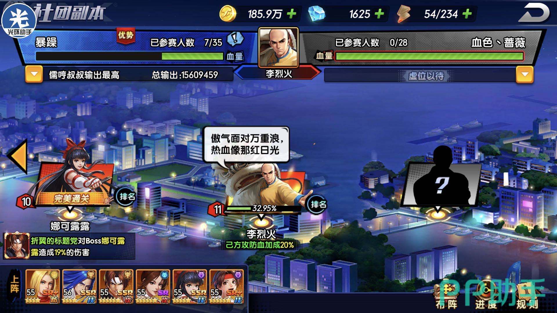 简单的看就要优先击杀霸王丸,如果玩家培养的角色有7个或者7个以上的话可以把不知火舞下了,因为这个阶段的不知火舞肯定是SR级别,超绝技百分之300的群体伤害,对于单体伤害来说过低。其他比如草稚京、娜可露露是必须带上的。