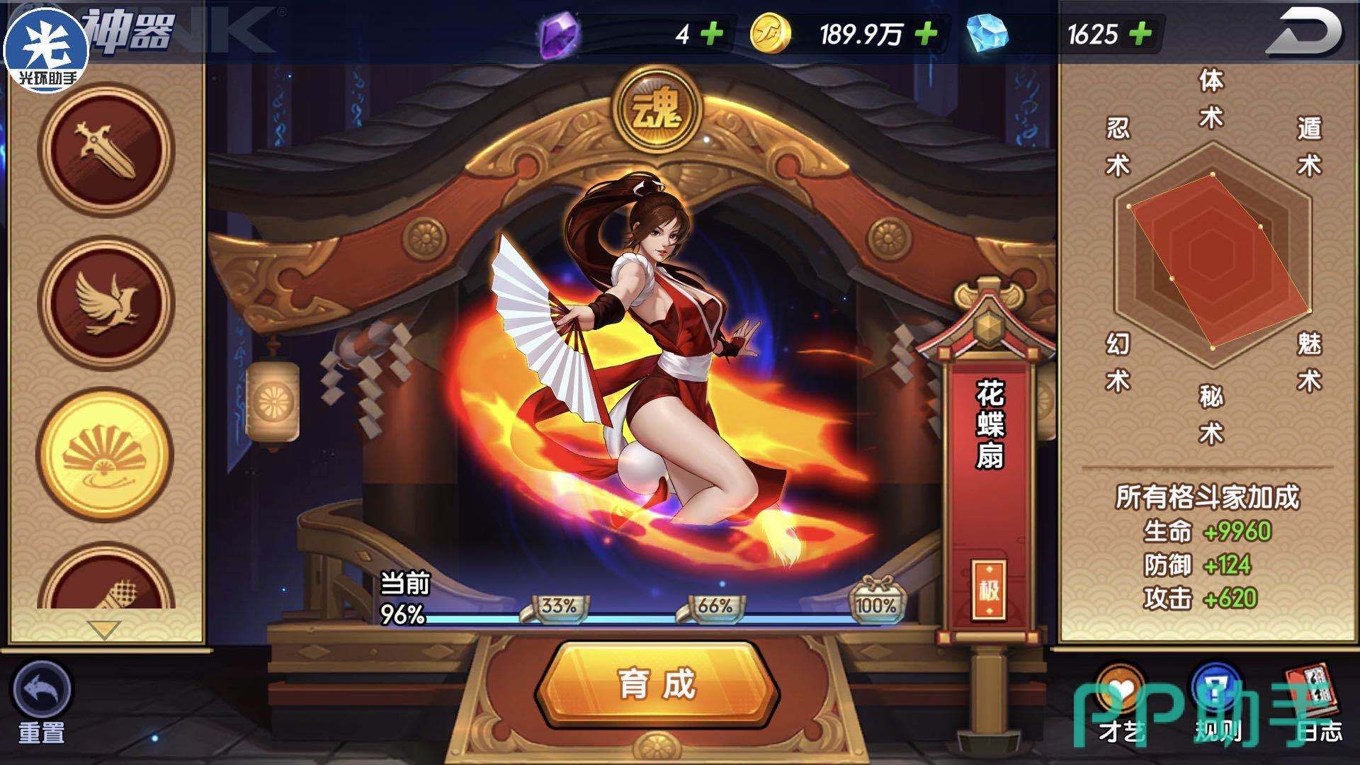 不知火舞的神器看情况升级,如果后期是准备打极限流或者其他流派的话就不要养了,不知火舞的输出很低只能当打火机使用,把不知火舞的神器提升到解锁下一个神器即可。