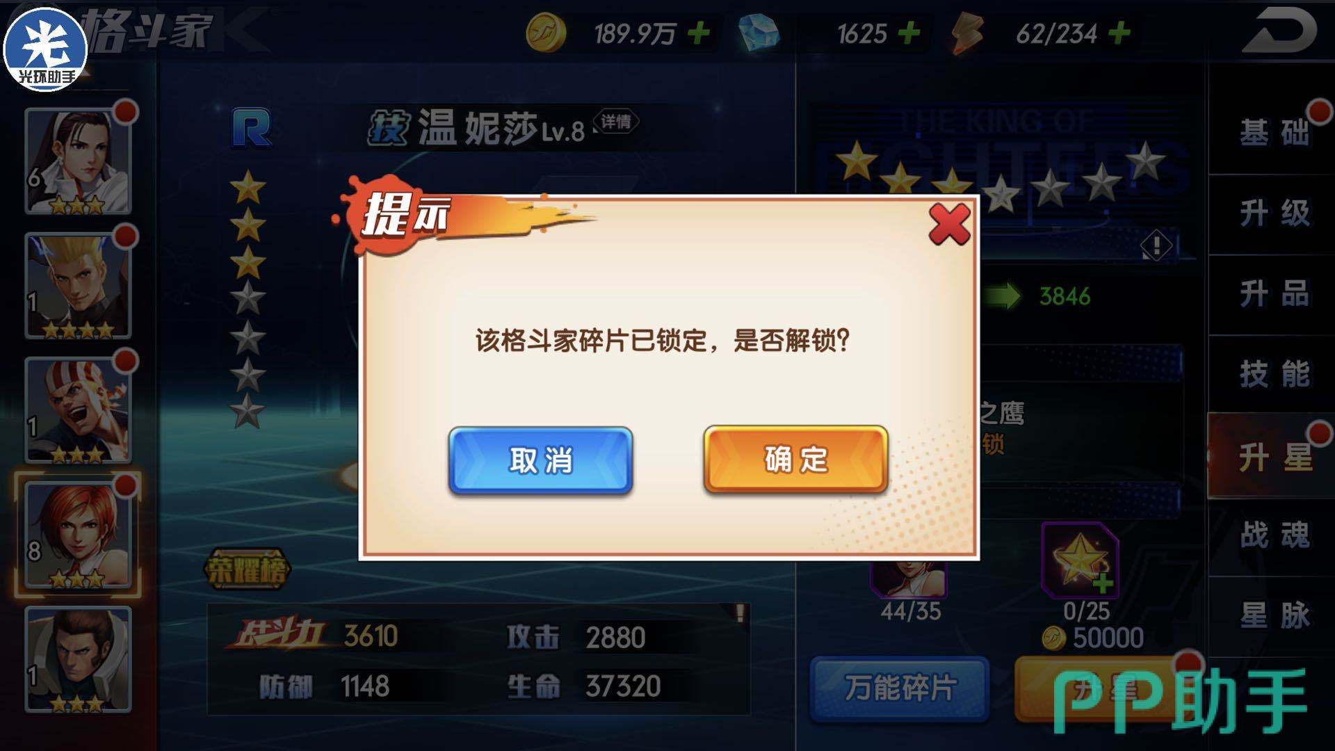 3.当没有获得某个角色时,使用升星能量的时候这个角色的碎片会被锁住,玩家可以点击解锁来将这些碎片当做升星能量使用。(锁住是为了保护没有获取的角色的碎片不被减少)