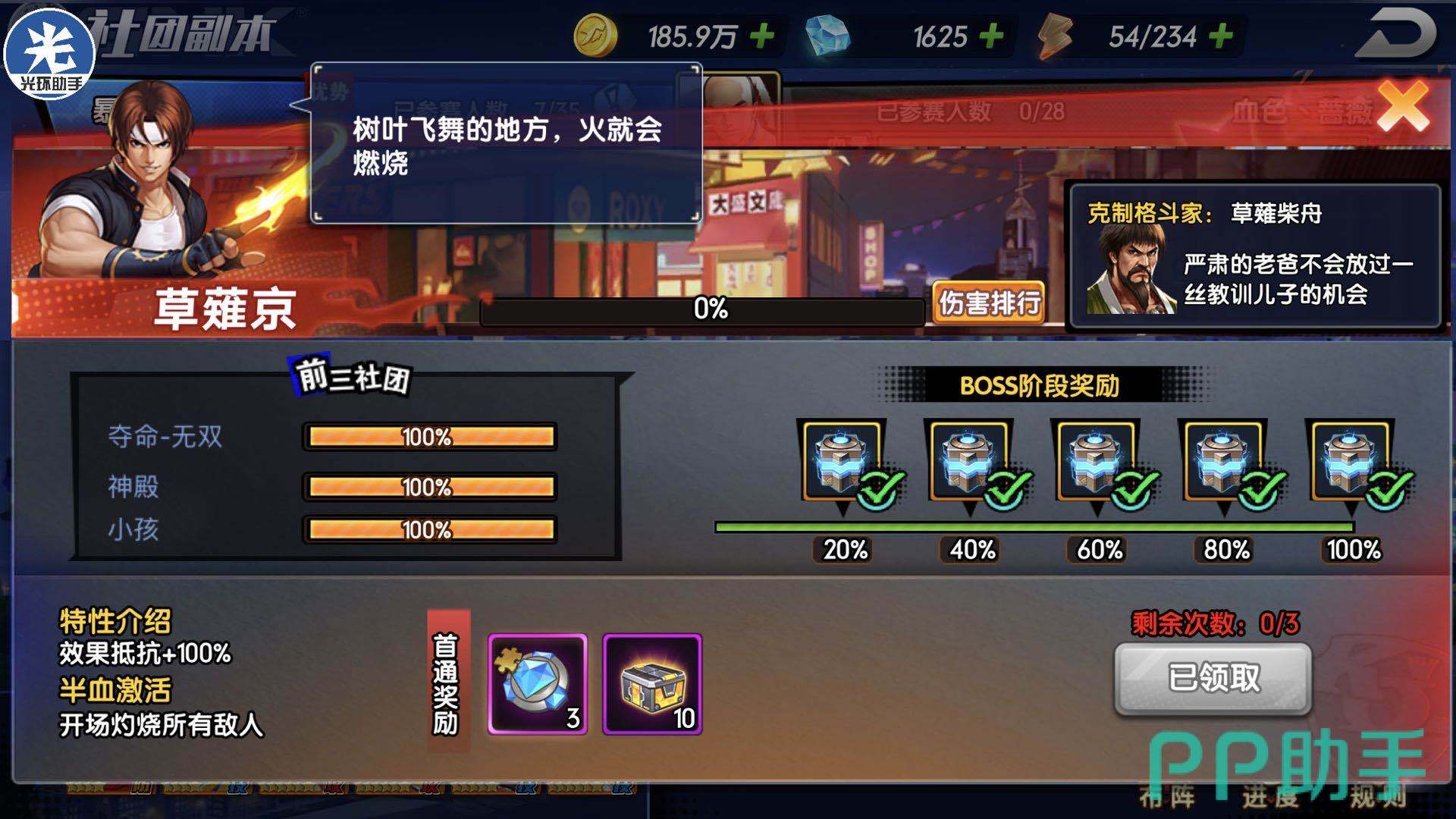 BOSS特效:每个BOSS的特效都不一样,但是都有解决方法,第一关草稚京的效果是灼烧加抗性增加,所以这个关卡带上麻宫雅典娜和暴击流的角色最好。第二关是BOSS对前排伤害增加百分之50,因此带上有不屈效果的角色在前排挨打,后面放3个输出就可以了。(其他的关卡也可以使用相应的角色解决)