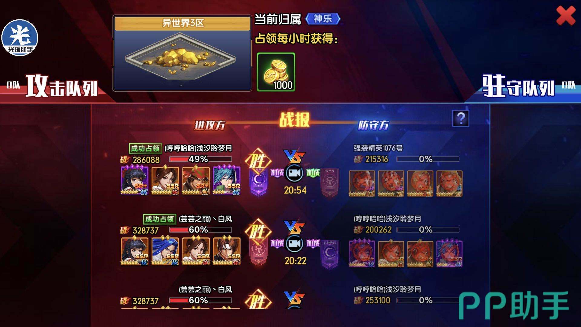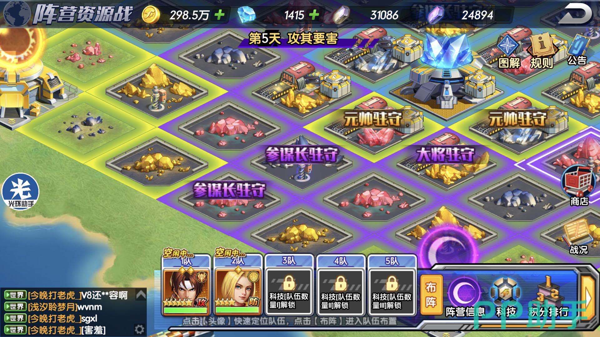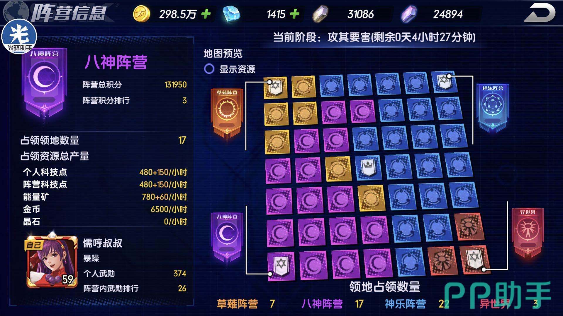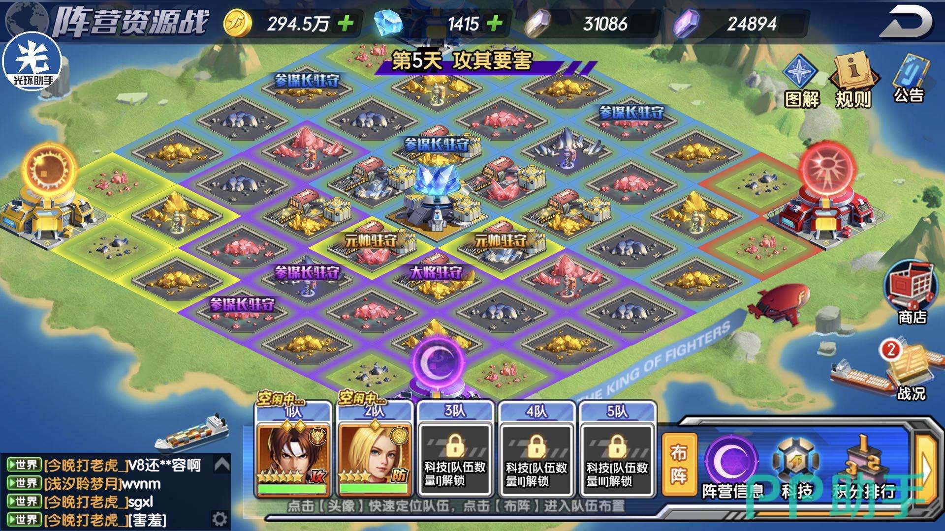 地图信息:当我们进入这个模式之后看到的地图可以得知以下信息,第一个是每个阵营占领了多少领地,从地块下面的颜色可以分别出来,比如八神阵营就是紫色的,实在不行可以点击阵营信息查看哪些领地是我们的。第二个是可以看到各个阵营目前的队伍流向,如果有队伍向其他领地移动的话在地图上可以看到小人的。