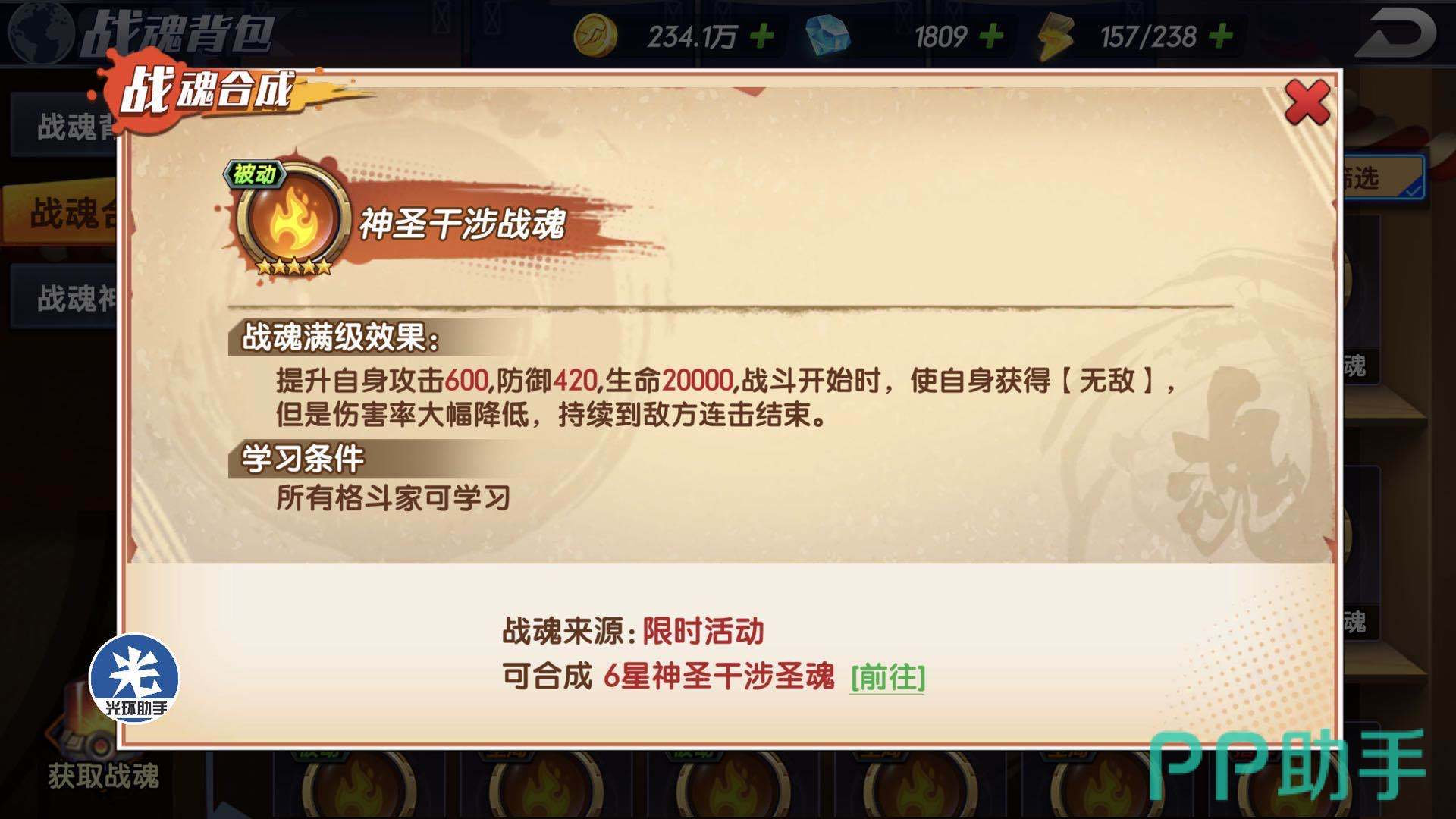 第四个是神圣干涉战魂,该战魂在竞技场效果不大,但是打关卡很有用,特别是精英关卡,把这个战魂装在有不屈效果的格斗家身上,然后前面放一个格斗家,后面放3个,战魂的效果会让前面的格斗家处于无敌状态,加上不屈效果可以抗几回合的单体输出。