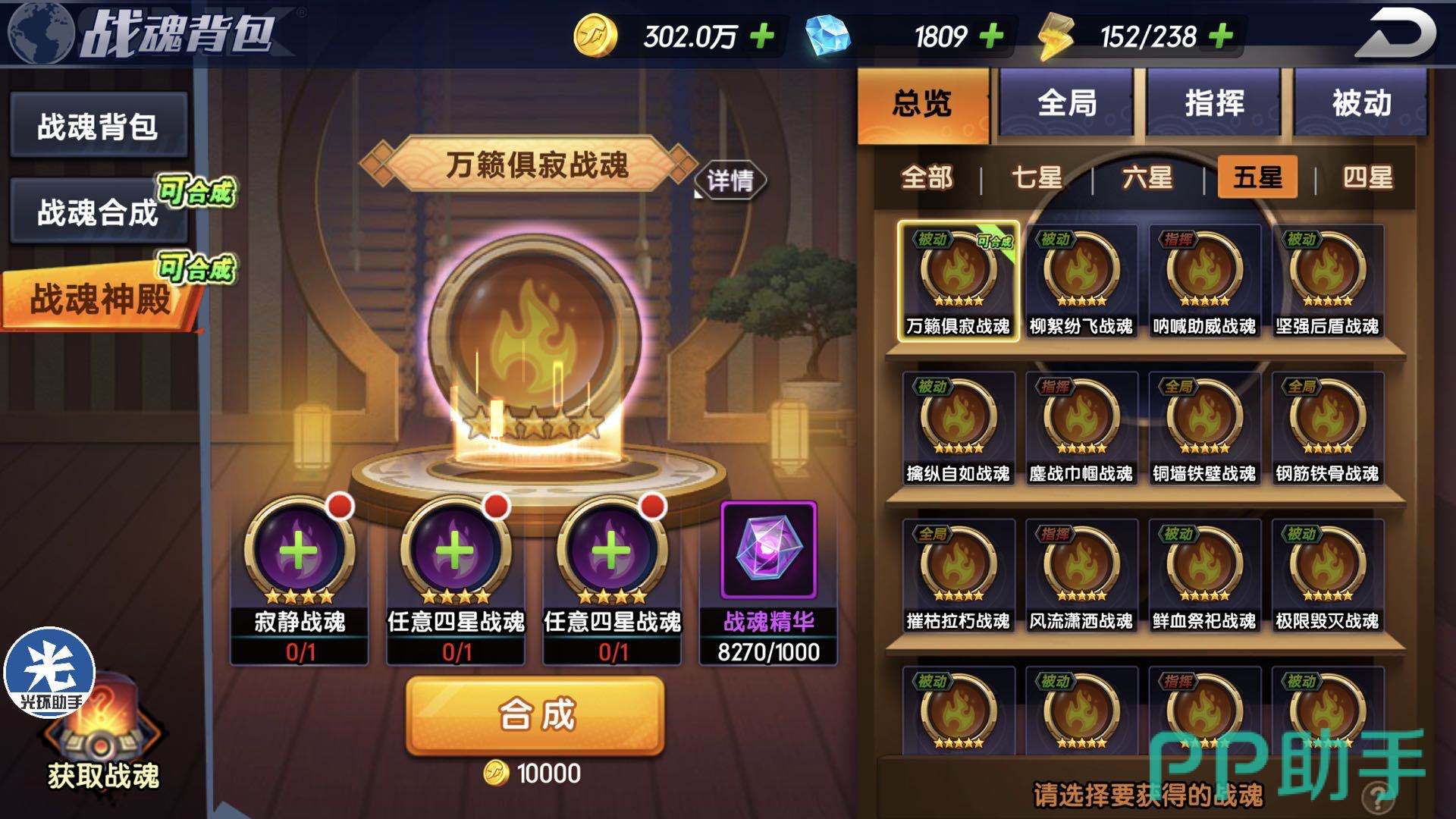 先从角色战魂中选出大部分玩家可以合成的5星战魂,有神之祈愿、禁言默杀、守望不渝、红莲焰潮、清心明性、应援祝福、元气领域、日轮天劫这些战魂。