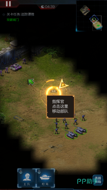 五、可以看到下图的就是指挥官的行动小队,根据提示,点击地面,行动小队就会跟着指挥官的指挥移动,右上角就是小地图的雷达显示,我们可以结合小地图,来进行实际的救援行动。下方是坦克和士兵,点击就是只调动其中的一个兵种行动。