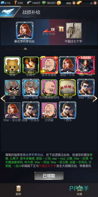 还有一个比较确定的事情,就是如果指挥官被人攻击,导致伤亡的部队数量超出了医疗中心,死亡了较多的部队,那么获得战损补给的概率就很大了,基本上都有。另外攻击敌人失败也是有一定的概率,攻击胜率的是不会获得战损补给的。