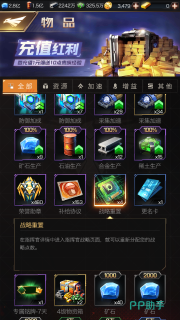 战略重置,顾名思义就是可以将之前所加点的战略重置,然后进行重新的分配加点。上图也可以看到,在物品栏里面的战略重置道具的解释——在指挥官详情中进入指挥官战略页面,就可以重新分配你的战略点数。