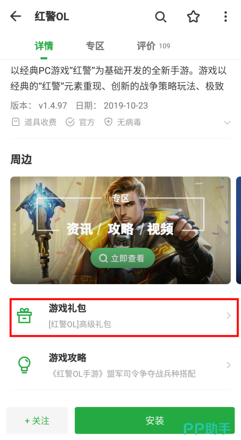 方法3:这个方法,主要针对已经下载豌豆荚APP的玩家。首先,打开豌豆荚APP,搜索红警OL,直接点击【安装】即可。