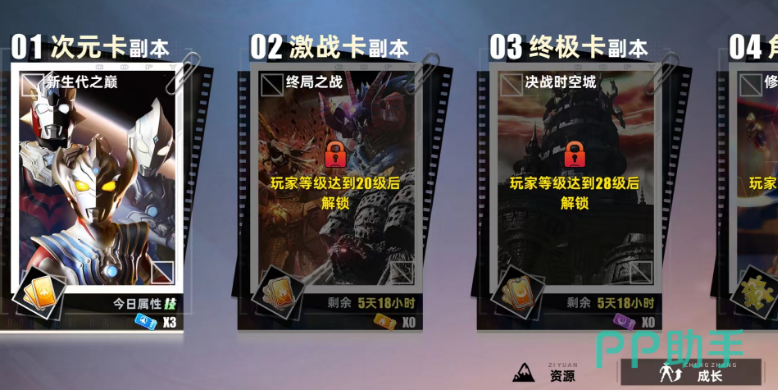 小伙伴们在主页左下角可以点击【历练】玩法后,通过选择【成长】按钮,可以看到【终极卡副本】,这个副本的话,是需要小伙伴们等级达到28级后,才可以开启挑战的,这个挑战玩法主要是可以获得【终极卡】的一些材料,这些材料在后续进行升级的时候都会用到!