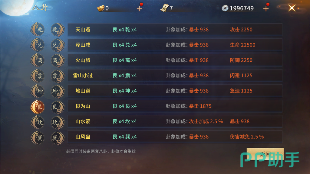 8个艮出发艮为山,艮主要提供暴击,暴击对于输出来说提高 很大,同时地皇的群体输出也并不差,所以暴击对于地皇来说收益也是十分的不错的。