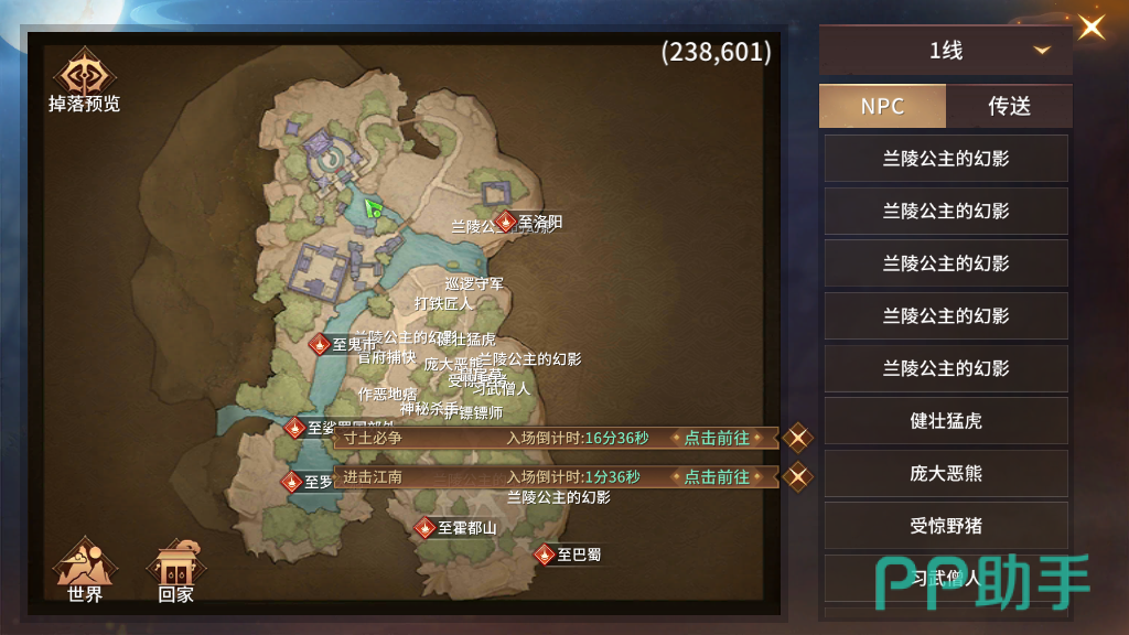 荷花潭位于洛阳郊外的(243,616)附近,首先我们需要点击主界面右上角的小地图,之后我们点击世界地图。