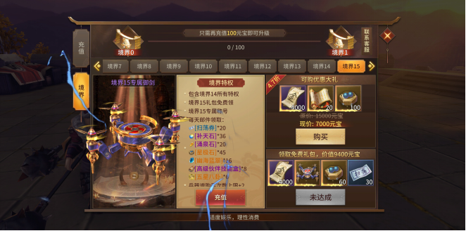 对于新手玩家,小编建议可以试充一下境界1,只需要花费100元宝。这是一个让玩家特权从无到有的过程,因此给的特权也是比较丰富、比较划算的。