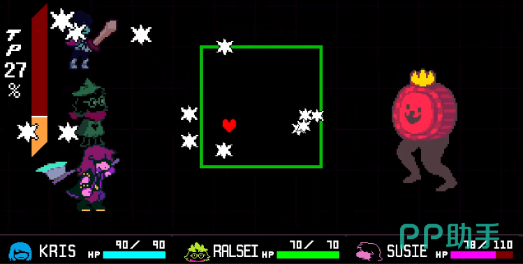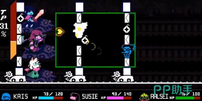 最终boss战机制与爬塔阶段的战斗存在关联,黑白色怪物可被驱散吸收以增强自身,红黑色怪物则需坚决躲避,同时boss会发射黑白色弹幕,玩家需在处理小怪的间隙,时刻关注弹幕轨迹,通过灵活走位规避,待boss恢复并触发剧情后,绿龟先生加入战斗,玩家需将Kris扔进泰坦中心位置,触发后续剧情以结束战斗。