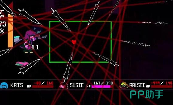 第一章的开始Kris从家中醒来,经历一番互动后,背起书包迈向学校,就在这看似寻常的学校里,与苏西的相遇成为了一切改变的起点,一系列超乎想象的意外事件如将二人卷入了一个神秘莫测的黑暗世界,初入这个黑暗世界的初始区域,路径相对单一,那些令人毛骨悚然的浮肿实体,玩家可以选择无视它们,然而前方会有邪恶的摆动物阻挡,玩家必须迅速反应,从右侧灵活绕后,精准攻击其核心部位,然后继续深入探索。