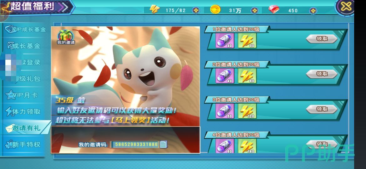 等级达到35级以前,可以邀请好友,好友数越多,并且他达到的等级越高,玩家们自己就能领取更多的p胶囊。