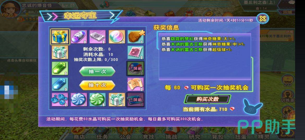 (4)幸运夺宝:可以获得捕捉券、遇怪券。玩家可以把不想要获得的奖励,点击进行屏蔽。每次需要花费60颗水晶。