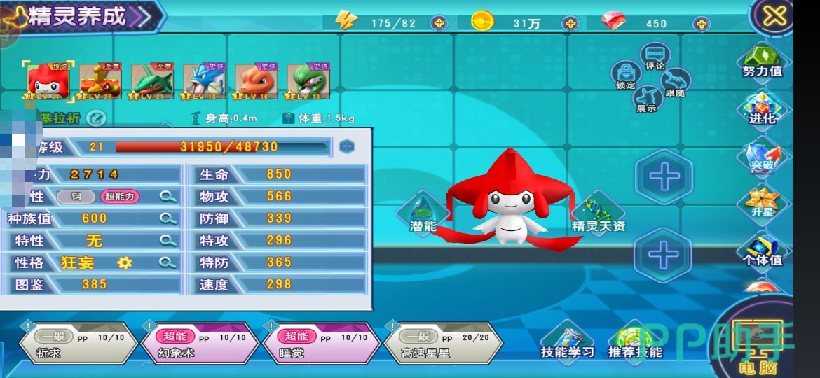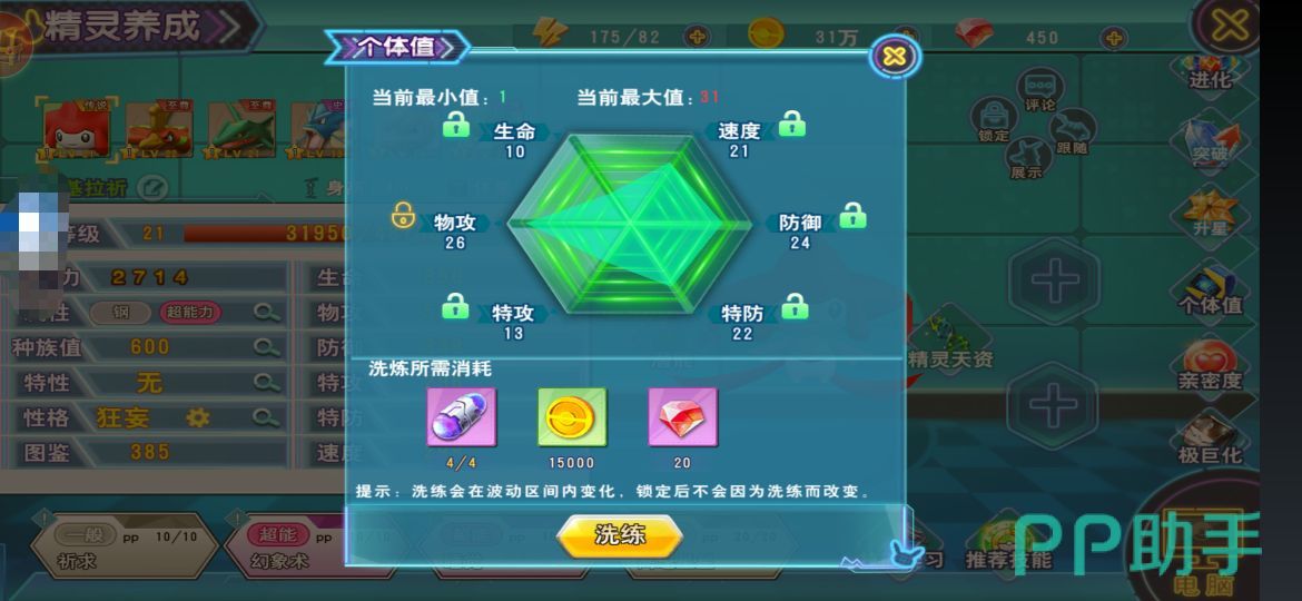 个体值有生命、速度、防御、物攻、特攻、特防这六种,每一种可提升最大值为31,最小值为1。