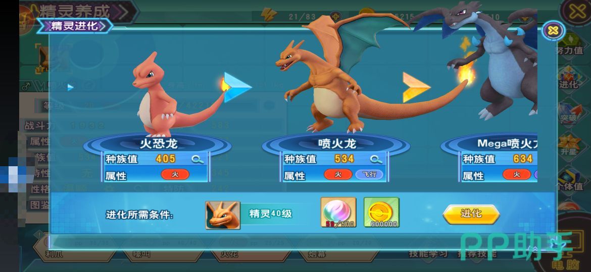 喷火龙达到进化条件需要等级达到40级,500个mega进化石,60万金币,进化以后种族值提升到634,物攻、特攻都有所提升。