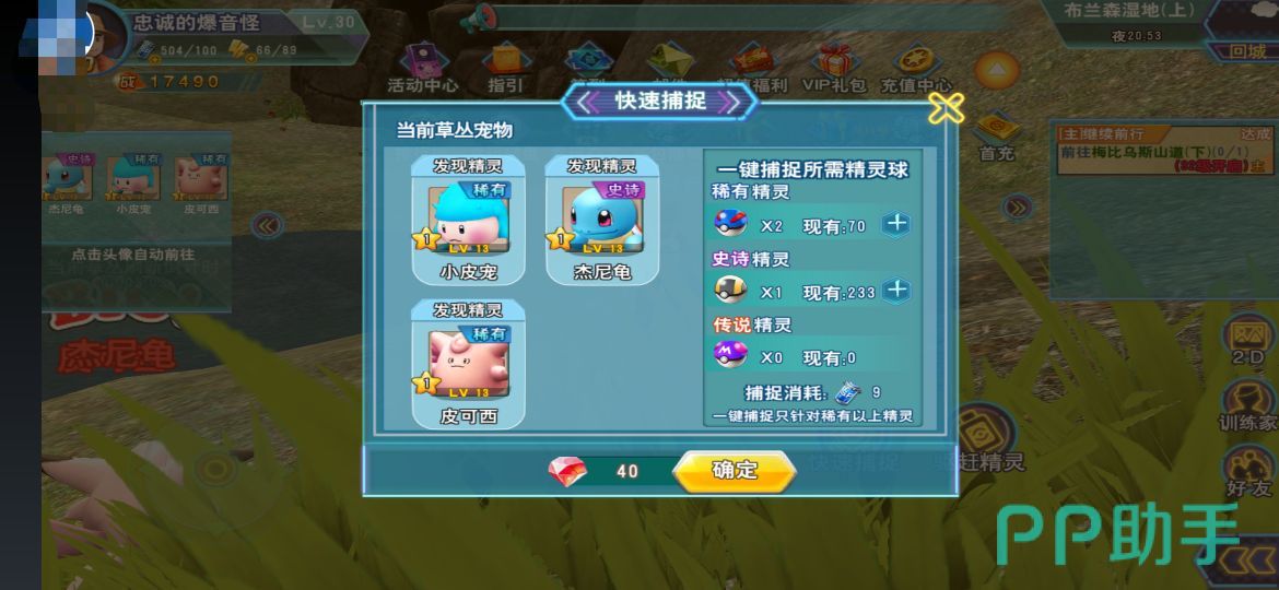 第一种:直接在出现杰尼龟的草丛附近使用快速捕捉,查看右边列表需要消耗的物资,还需要花费40颗水晶。